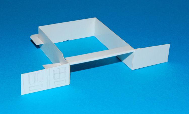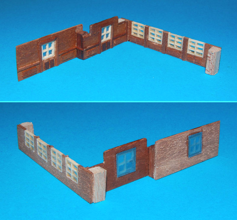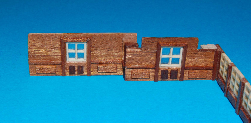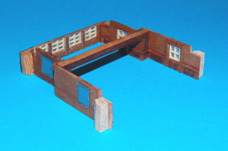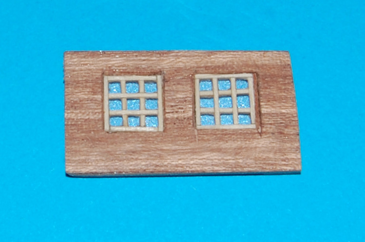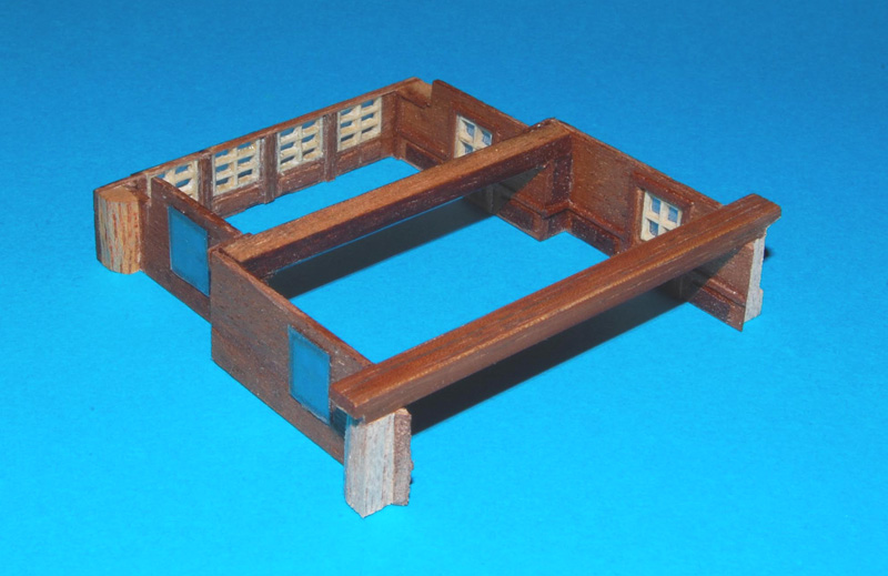Ścianki są z obłogu (1 mm) meranti, okna (ok. 7 x 7 mm) wykonałem z forniru jesionu z dwoma, trzema i czterema szprosami (sposób wykonania okien jest w relacji, więc nie powtarzam :) ).