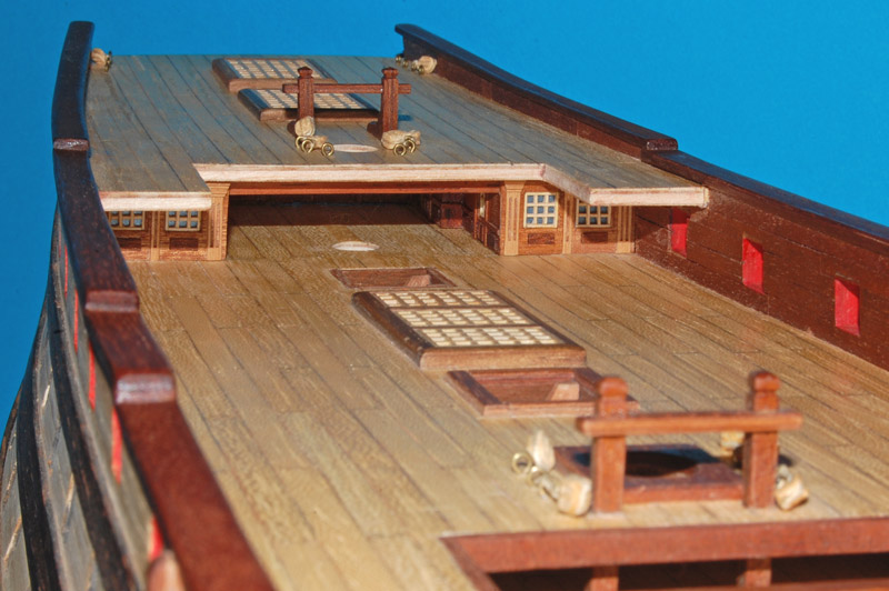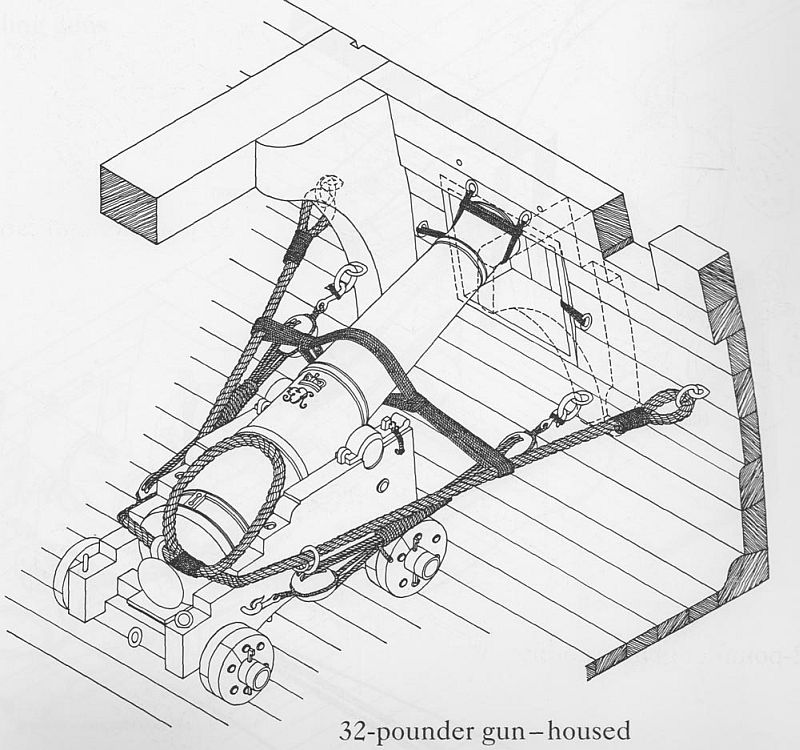 armaty po prostu inaczej ustawiano. Bardzo popularne było ustawienie wzdłuż burty i mocowanie do niej w tej pozycji, zdarzało się mocowanie (bardzo dokładne, dające kompletne unieruchomienie) do pierścieni usytuowanych w różnych miejscach pokładu (tak, jak na obciętej części tego rysunku są ustawione obie 12-funtówki na pokładzie dziobowym - mocowanie pominięto dla uproszczenia).