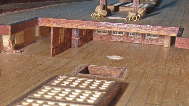Otóż przed bitwą rozbierano na pokładach działowych WSZYSTKIE PRZEGRODY i najczęściej chowano je do ładowni. Istnieją piękne rysunki z epoki, pokazujące pokłady rufowe liniowców w tym stanie (też Victory), gdzie widać każdą klepkę pokładu aż do okien rufowych, ponieważ oprócz dział zostawało tu tylko koło sterowe i naktuz. Wszystkie pięknie dekorowane ścianki apartamentów admirała również znikały, choć na oko wydają się tak solidne.