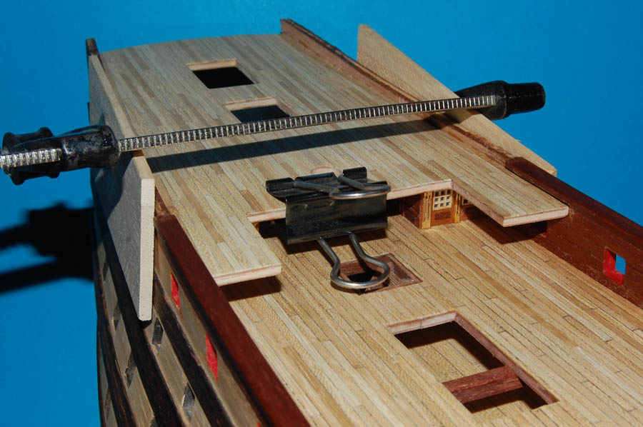Zmieniaj lokalizację koła sterowego (o ile nie uparłeś się, aby model odzwierciedlał historyczny oryginał) - ja w swoim Montanesie umieściłem koło sterowe tak aby było widoczne - warto tak dopieszczone elementy jak wykonane przez ciebie koło sterowe wyeksponować - i dodatkowo będzie też bardziej widoczny naktuz - także wykonany z dbałością o szczegóły.