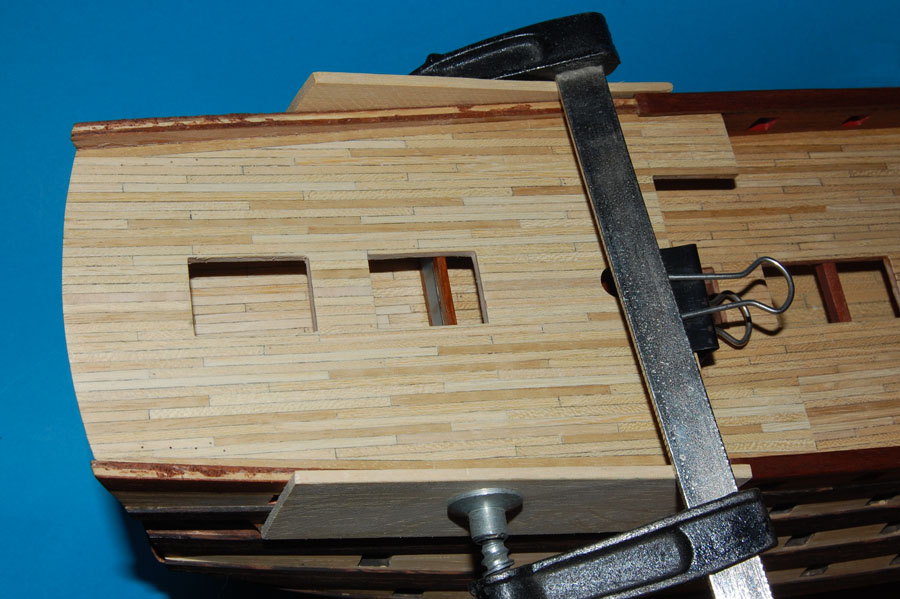 Na powrót powklejałem kolejne detale, nagielbank na śródokręciu, okleiłem wewnętrzne nadburcia (tu zrobiłem minimalną korektę łuku - poprzedni był za duży), i na koniec parapet.