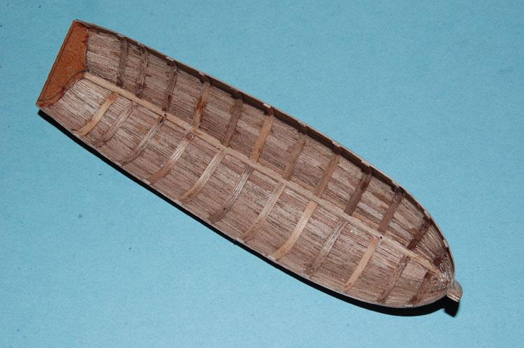 Skorupa gotowa (pierwsze poszycie), i tu zdarzyła się skucha. Szalupka mi spadła i złamała się dziobowa igła.