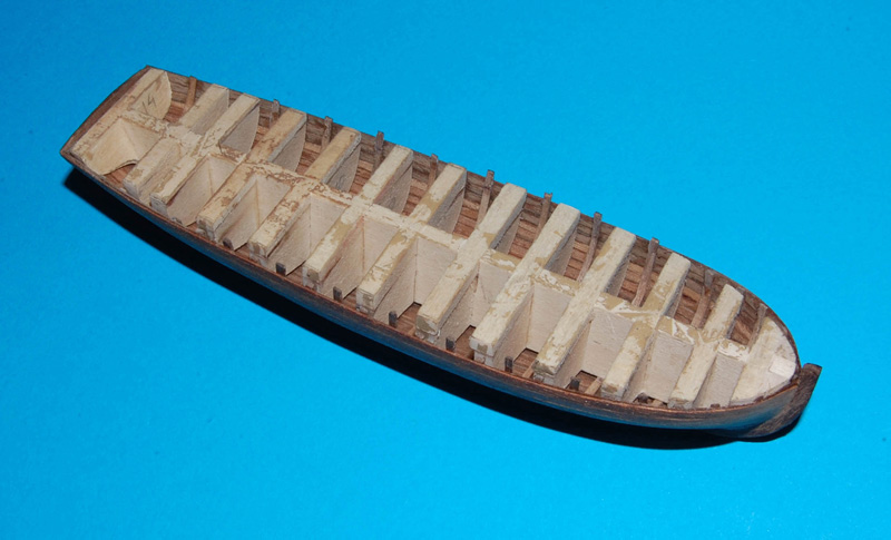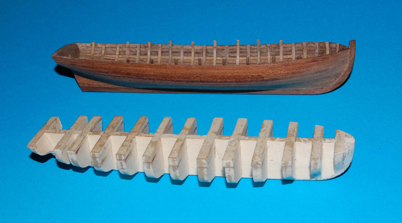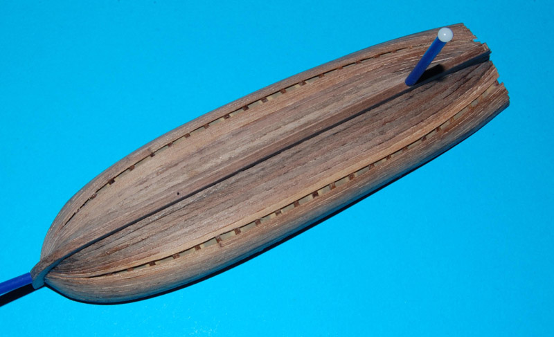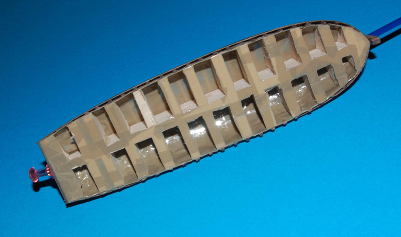 W kopycie nie wypełniłem przestrzeni między wręgami, więc wyciąłem folię w dostępnej części kopyta i przy klejeniu listewek na burcie dociskałem pęsetą, a na dnie podkładałem klocek.
