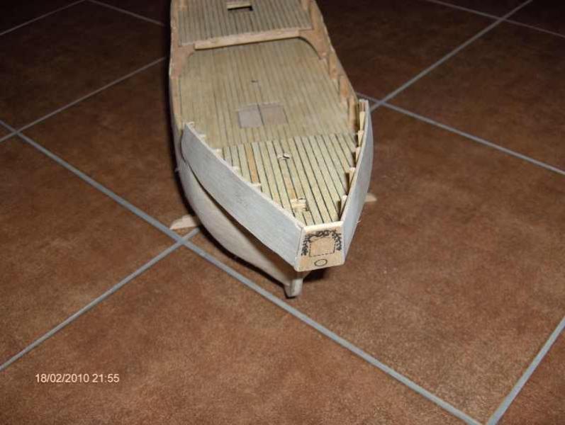 Wykonałem pokład rufowy wraz z burtami oraz wejście do kajuty kapitana. Niestety nie mam zdolności rzeźbiarskich i herb na dziobie wyszedł jak wyszedł.