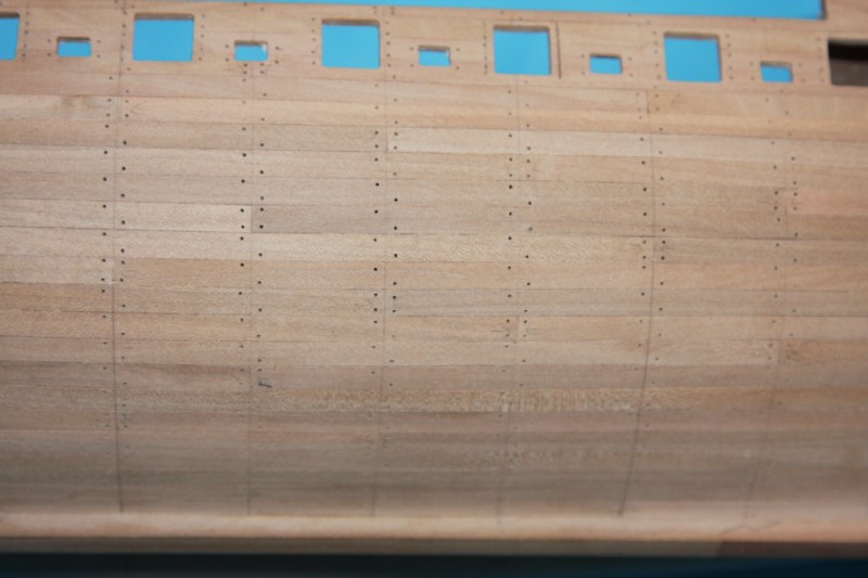 Żeby nie wyglądało,że zawiesiłem relacje postanowiłem pochwalić się moimi osiągnięciami.Trochę to trwało,ale udało mi sie podziurawić obie burty choć jeszcze bez rufy.Kosztowało mnie to 6 wierteł ale udało mi się wyprodukować coś około 4400 dziurek.Teraz pozostały jeszcze dziurki na rufie i zatykanie wywierconych otworów drucikiem mosiężnym.Na razie zaopatrzyłem się w 40 m i mam nadzieję,że wystarczy.Na pokład poszło ok 20m.Moja żona twierdzi,że jestem popie......y i pewnie ma rację.