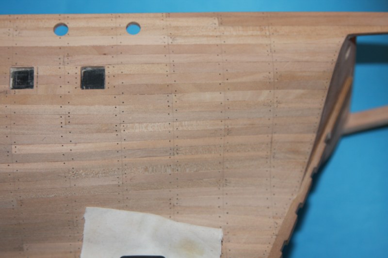 Pracowite zatykanie uprzednio wywierconych dziurek w poszyciu prawie zakończone.Pozostały jeszcz listwy nadburcia górnego pokładu.Postanowiłem trochę poeksperymentować.Ponieważ nadburcie górnego pokładu,odbojnice i poręcze chcę pomalować na czarno,resztę dziurek pozatykam dopiero po malowaniu.Zobaczymy co z tego wyjdzie (podpatrując modele Baranowa-wyglądało to świetnie).