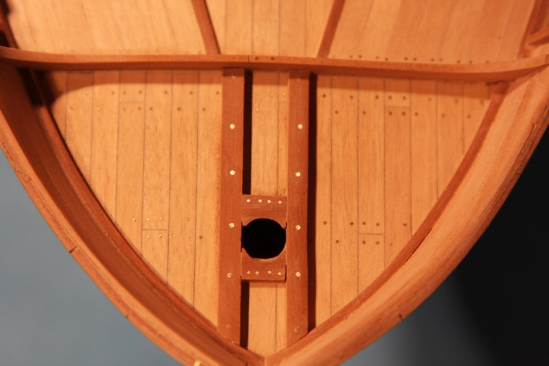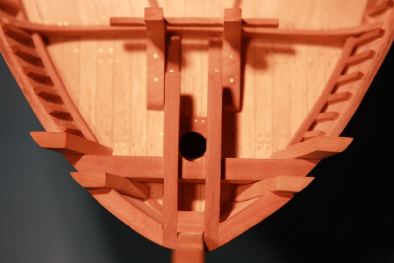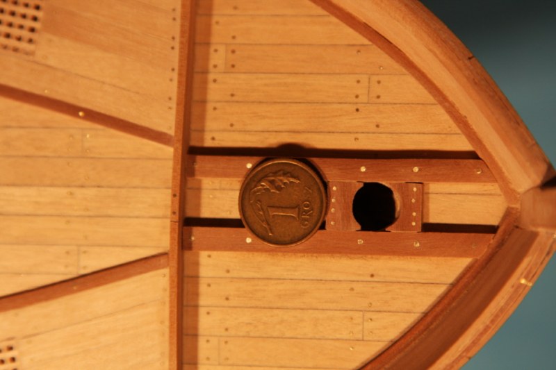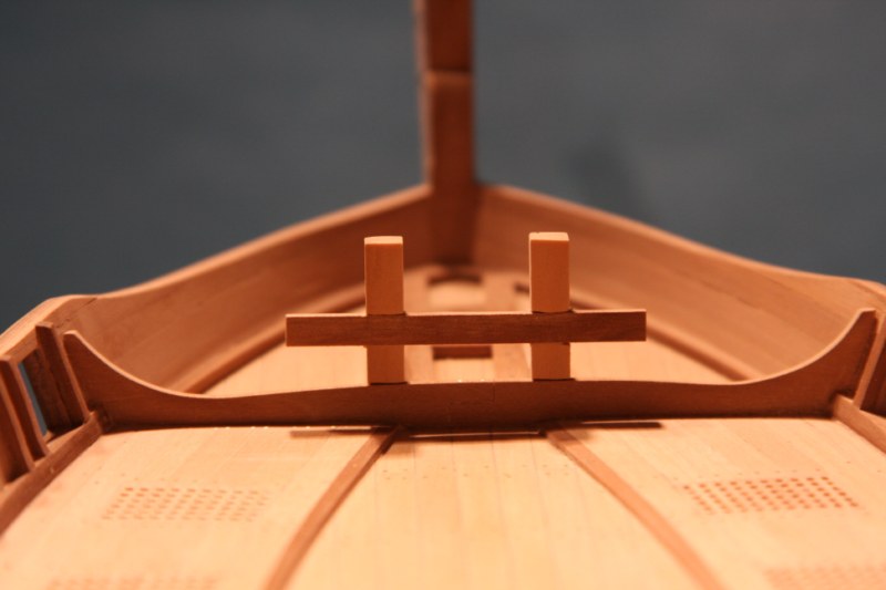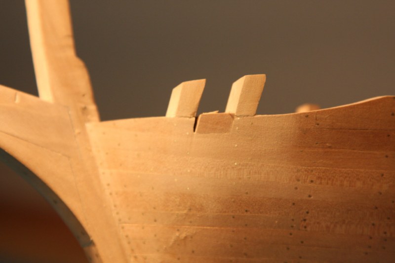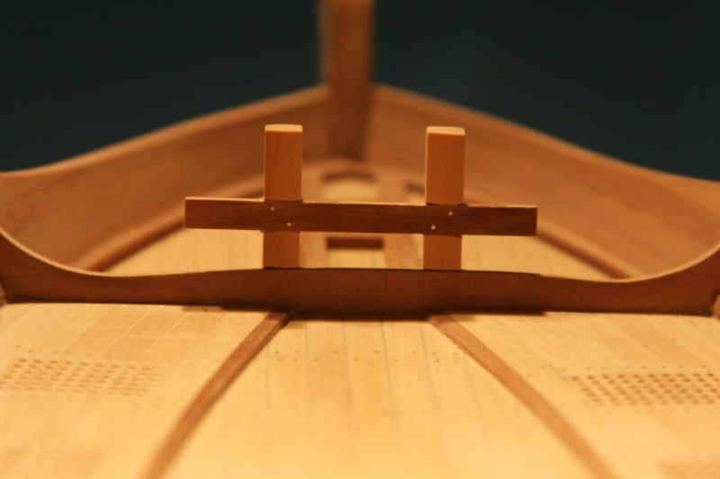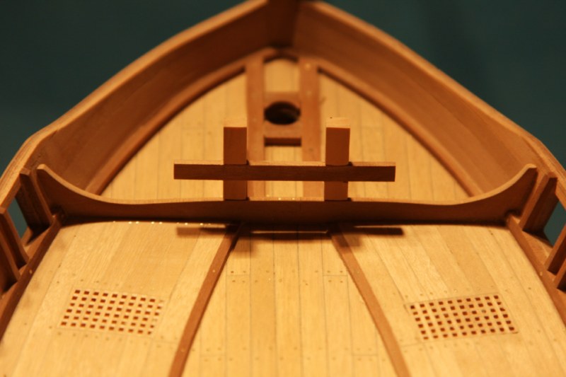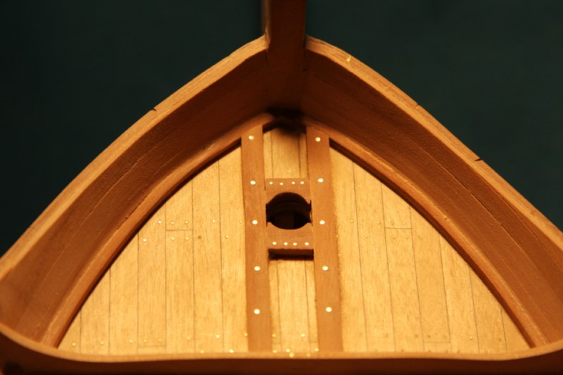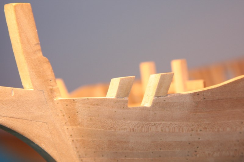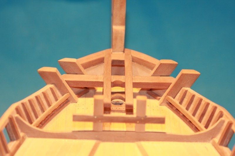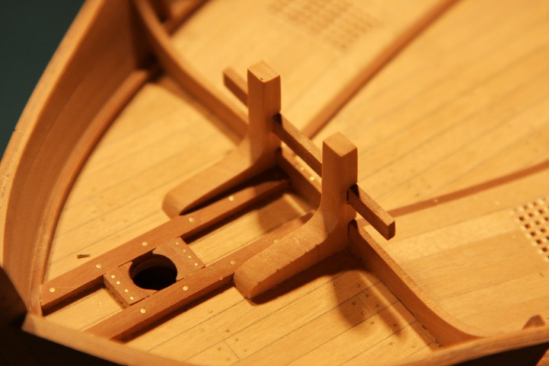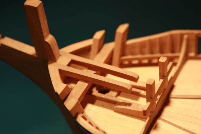 Zabierając się do dziobu absolutnie nie mogłem dogadać się z planami zestawowymi.Delikatnie mówiąc to co zaproponowała firma nijak się miało do ówczesnych konstrukcji.Dlatego postanowiłem nieco zmodyfikować zestaw.Niestety tym razem "nieco" wiązało się z większą demolką już wykonanych elementów.Uprzedzając słowa krytyki prosiłbym o wyrozumiałość.Modyfikacje odbywały się nie w oparciu o plany a jedynie o zdjęcia znalezione w intertnecie.Co oznacza,że nie muszą być całkowicie zgodne z rzeczywistością a są jedynie moją wolną twórczością artystyczną.Niestety nic lepszego nie byłem w stanie wymyślić.Do zakończenia przygody z dziobem brakuje jeszcze mocowania masztu do belek biegnących od stewy dziobowej.Ale to dopiero po ustawieniu masztu.