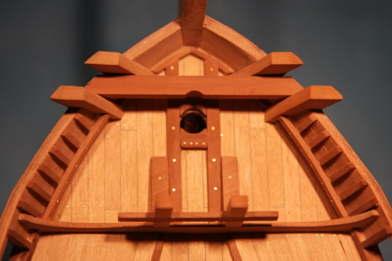 W tym czasie znęcałem się nad drzwiczkami do ambrazur,przy których prawie poległem(trzykrotnie chciałem wyrzucić model do kosza).Ale do rzeczy.Podstawę stanowiły listewki z gruszy 2x6mm -oczywiście od Pana Mirka(docelowo zeszlifowane do 1.5mm).W pierwszym etapie nakleiłem papier milimetrowy na klej szkolny pożyczony od dzieci.Miejsca pod przyszłe zdobienia najpierw nakłute igłą,później nawiercone wiertłem0.5mm i zapchane drucikiem 0.5.Następnie papier milimetrowy zeszlifowany listewki nacięte i doszlifowane do rozmiaru 10.8x5.4mm (mniej więcej).Imitacja zawiasów wykonana z rozwalcowanego drutu 0.5mm na blaszkę 1x0.1mm.Oś zawiasu z gwożdzika 0.5mm.Uchwyty wykonane z gotowych szpilek (drucik 0.5mm-oczko 2mm).Kółko wykonane z drutu 0.5mm/śr.2mm.Wszystko razem polutowane w całość i poczernione kwasem selenawym.Niestety zdaję sobie sprawę z nie do końca zadowalającej precyzji,ale w tej chwili nie stać mnie nanic innego.I to by było na tyle.Teraz walka ze sterem.