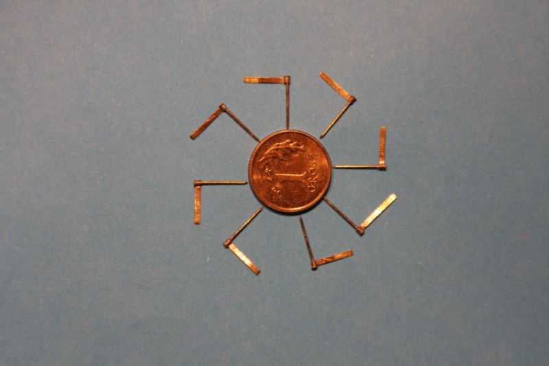 Wykonane z drutu mosiężnego śr.0.5mm rozwalcowanego u zaprzyjaźnionego jubilerana blaszkę szerokości ok.1mm i grubości ok.0.1mm.Osie zawiasów wykonane odpowiednio z gwoździków 0.5mm (drzwiczki do ambrazur-będą montowane nieco później) i 0,4mm widoczne na zdjęciach.