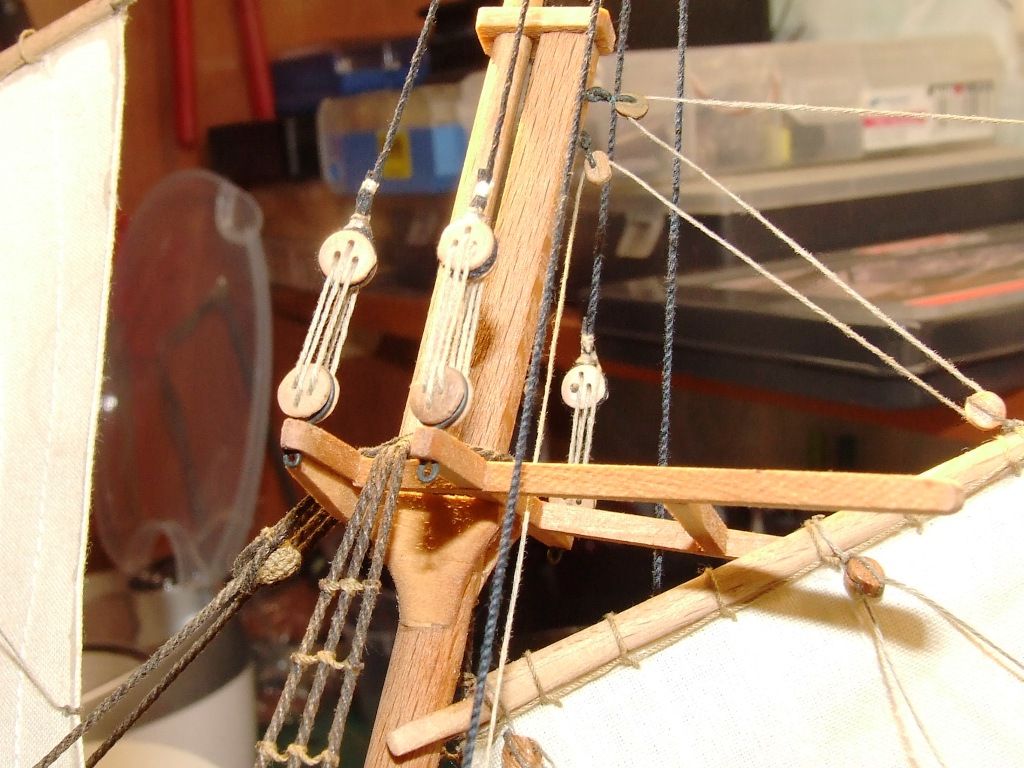 Teraz zamontuję potrzebne bloczki do rei i drzewców gafli.