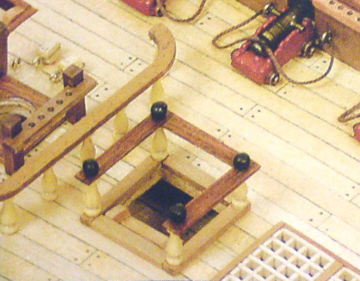 Zrobiłeś sobie wyciąganą ta półokrągłą poręcz za belką z naglami za grotem ??? Jeśli nie to ciekawe jak tam cokolwiek przywiążesz - zbuchtujesz. Ja ogólnie wszystkie tralki wstawiłem na gwoździk 1 mm. Można okręt cały za nie powiesić i nie ma problemu z tym że przy jakiś innych pracach się trąci przyklejone do pokładu na styk i się odłamie , a te co mogą przeszkadzać to zostawiłem demontowalne na gwożdzikach wciśniętych w pokład. Ławy wantowe też do ostatniego momentu wklejenia wszystkich jufersów poczyniłem wyciągane posadowione na kilku gwoździkach bo łatwiej się mocuje i obrabia w rękach niż na modelu. Takie drobne uwagi taktyczne ułatwiające życie.