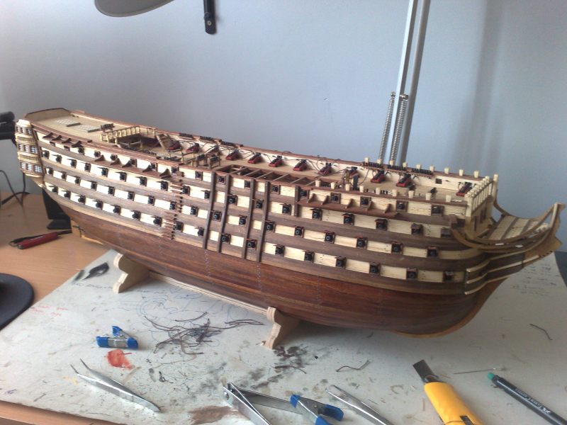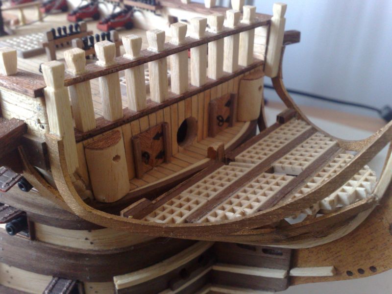 Zrobiłeś sobie wyciąganą ta półokrągłą poręcz za belką z naglami za grotem ??? Jeśli nie to ciekawe jak tam cokolwiek przywiążesz - zbuchtujesz. Ja ogólnie wszystkie tralki wstawiłem na gwoździk 1 mm. Można okręt cały za nie powiesić i nie ma problemu z tym że przy jakiś innych pracach się trąci przyklejone do pokładu na styk i się odłamie , a te co mogą przeszkadzać to zostawiłem demontowalne na gwożdzikach wciśniętych w pokład. Ławy wantowe też do ostatniego momentu wklejenia wszystkich jufersów poczyniłem wyciągane posadowione na kilku gwoździkach bo łatwiej się mocuje i obrabia w rękach niż na modelu. Takie drobne uwagi taktyczne ułatwiające życie.