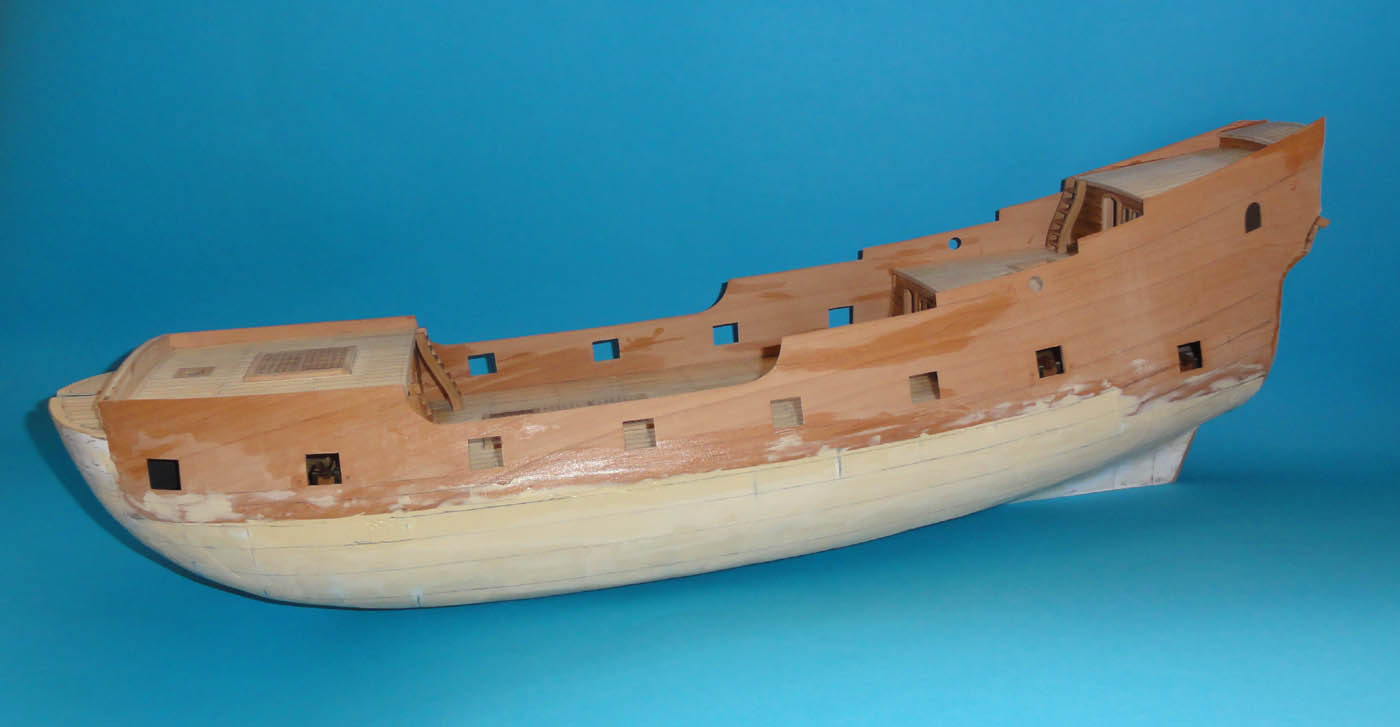 Przykleiłem fornirowe burty, wyszpachlowałem i wyznaczyłem wg wycinanki teoretyczne linie przebiegu poszycia... zaczynam walkę z kilem i dziobnicą po czym przyjdzie czas na odbojnice i planki ;)