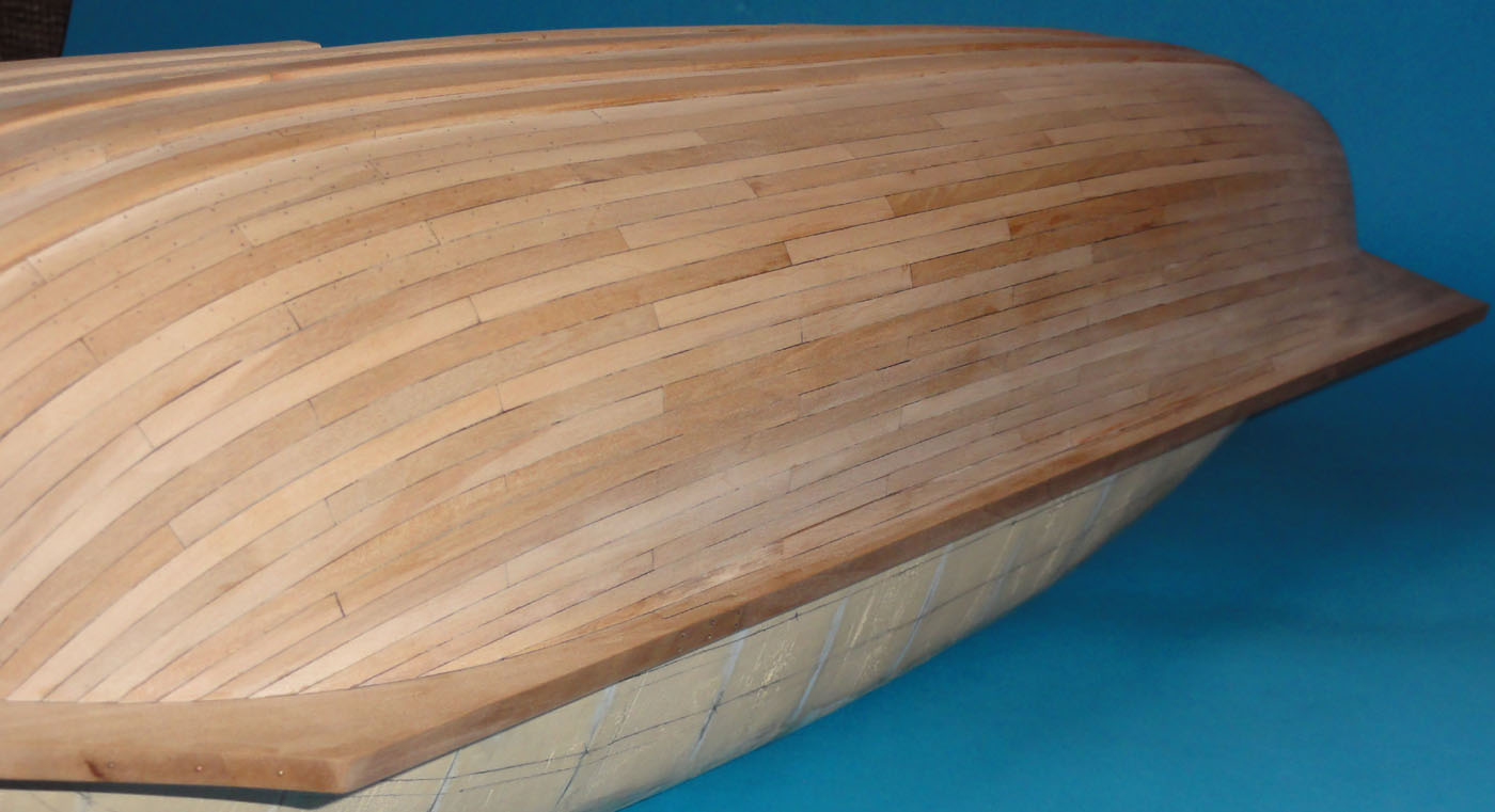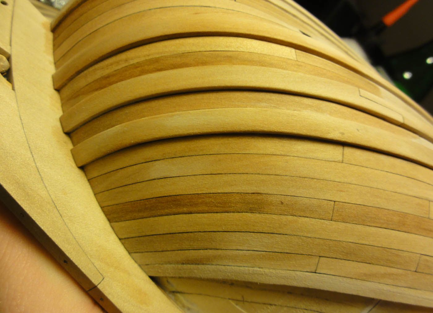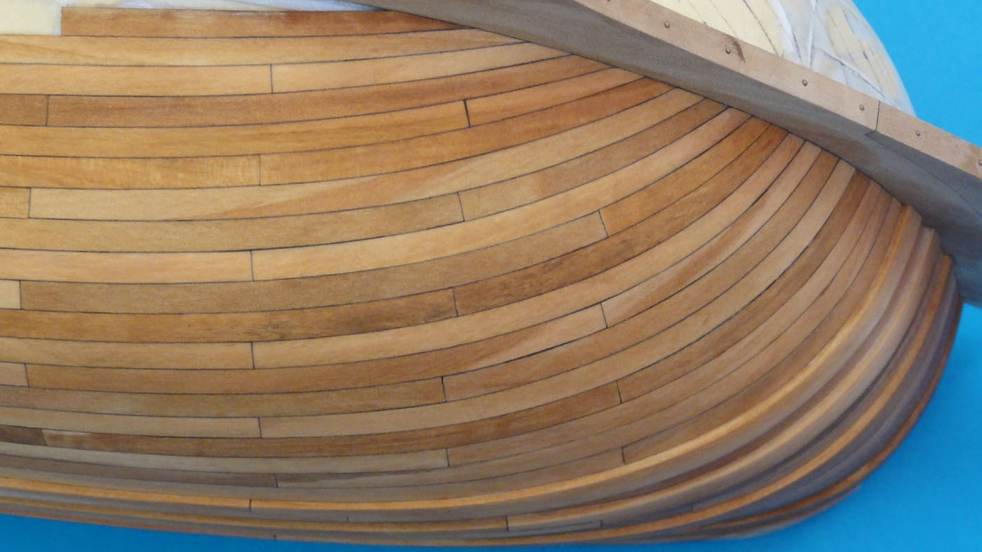 Każda położona listewka poszycia jest indywidualnie formowana do kształtu poszycia... jak widać listewki w części dziobowej są kalibrowane (zwężane) dzięki czemu wszystkie się zmieszczą w stewie...