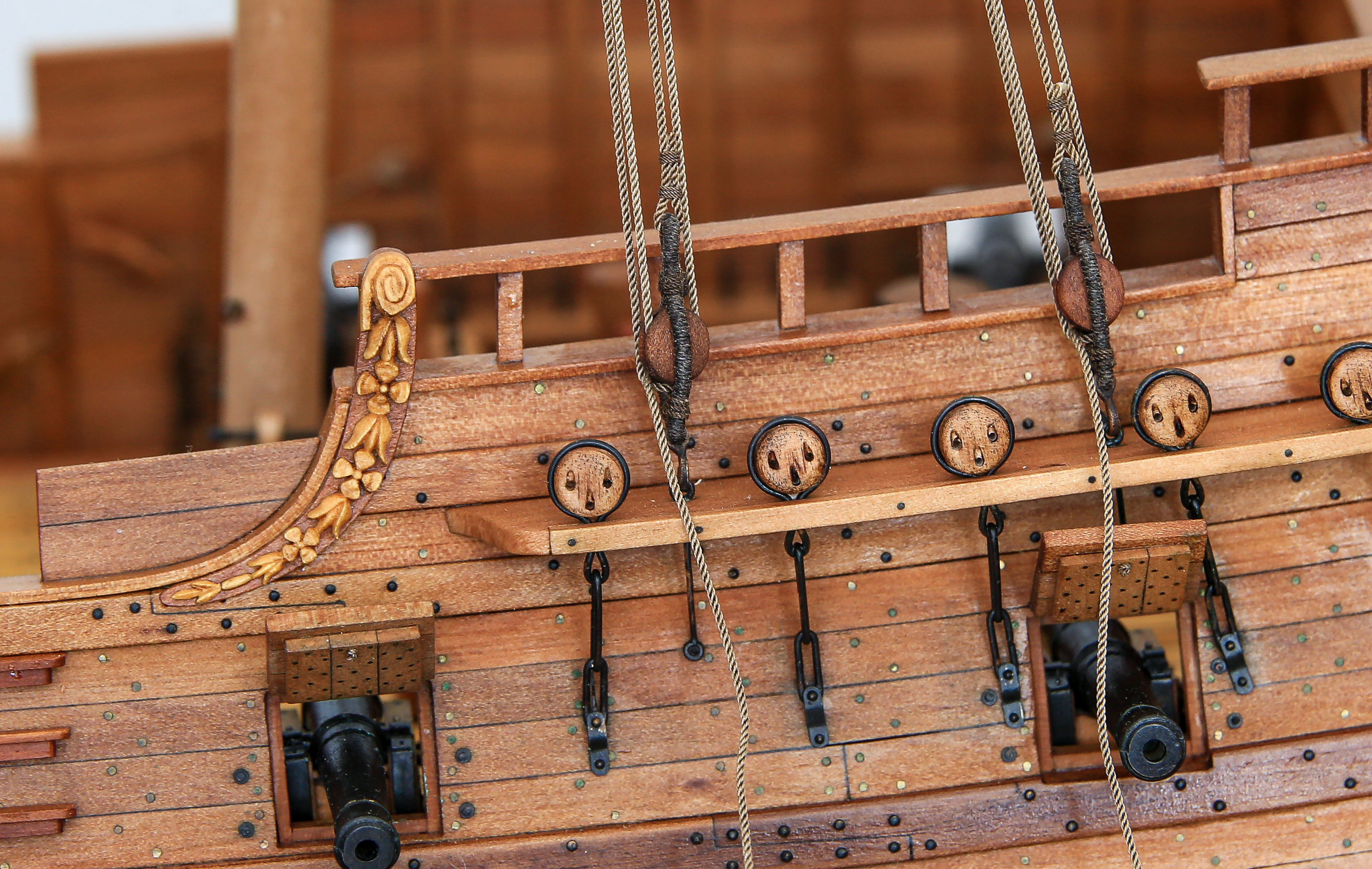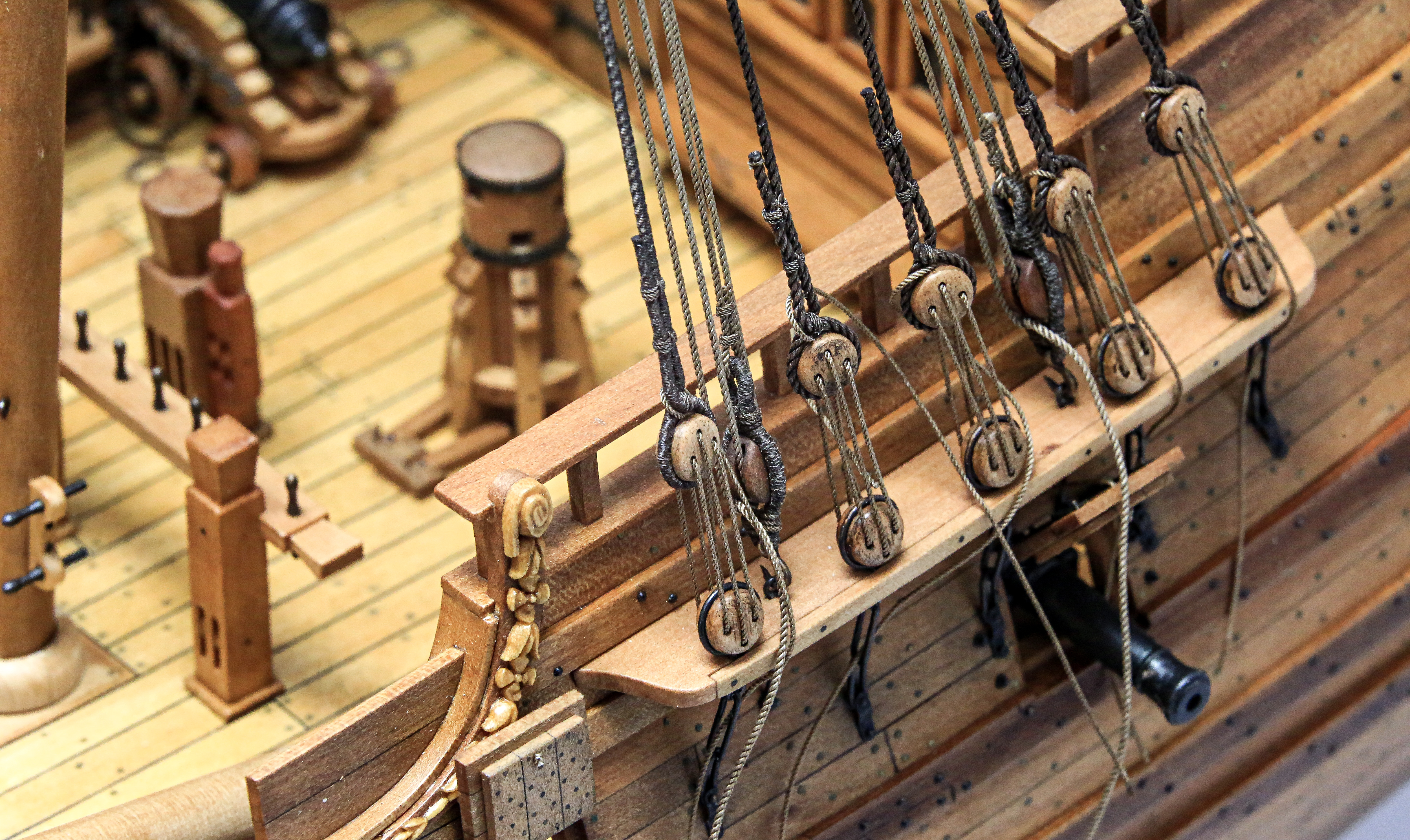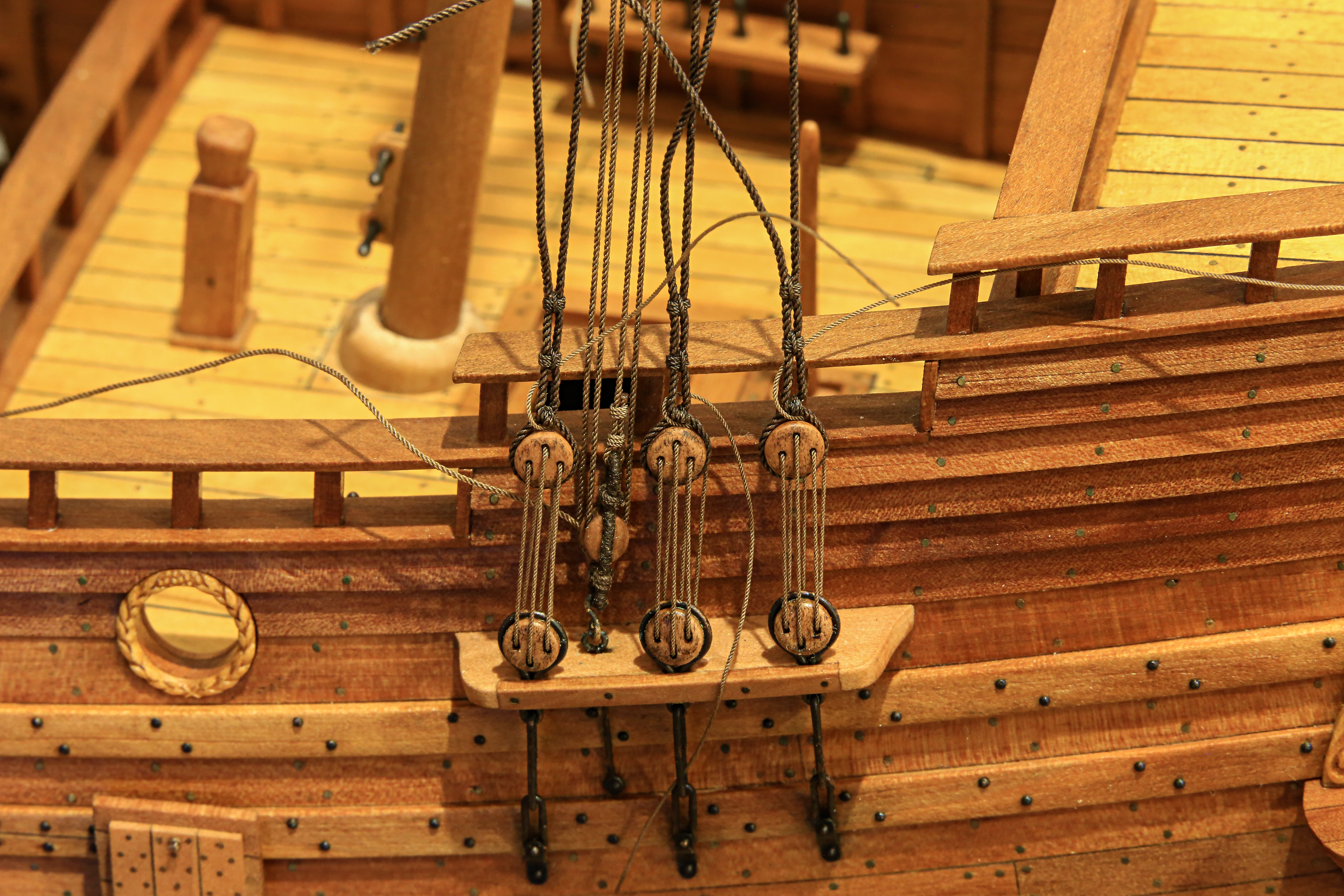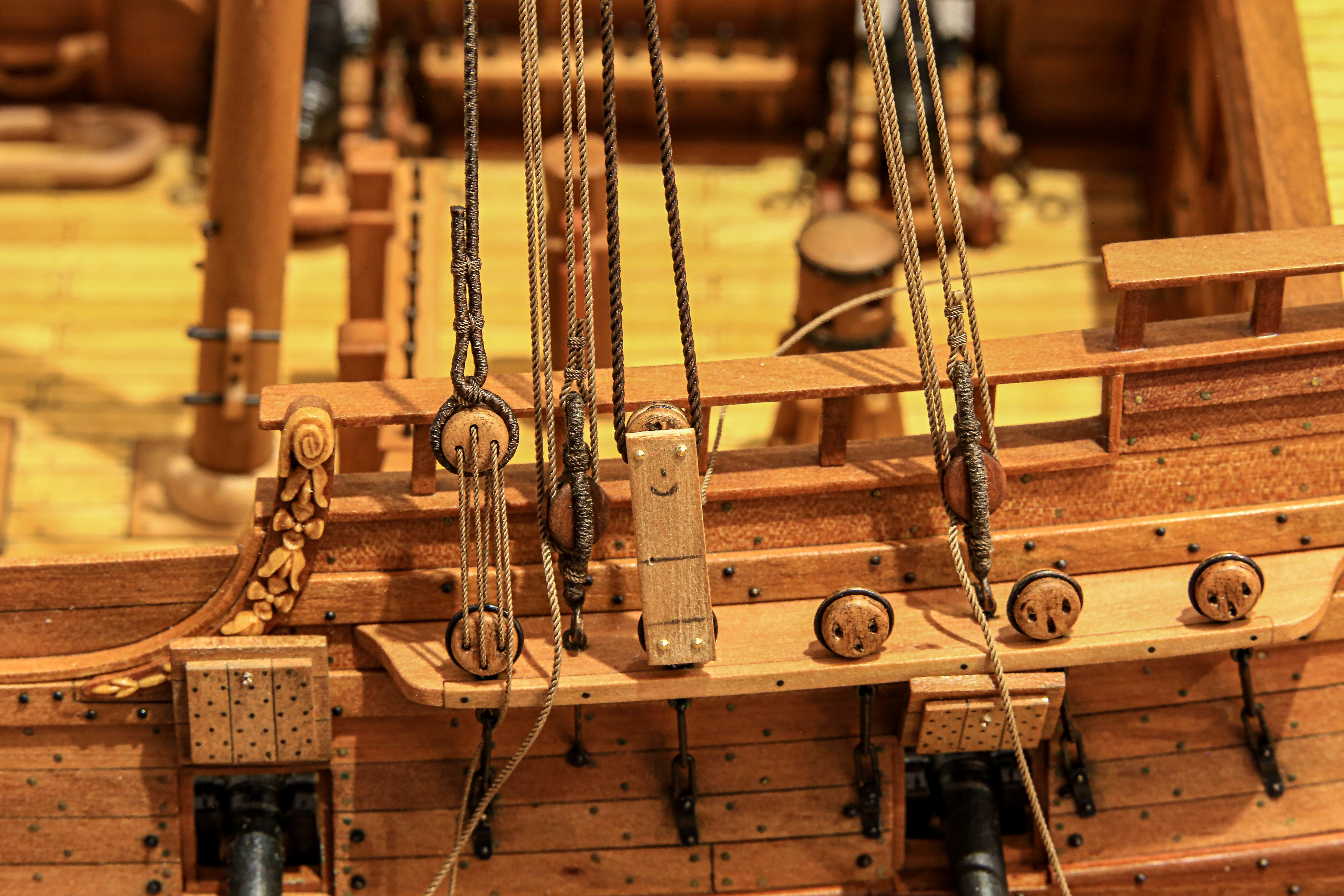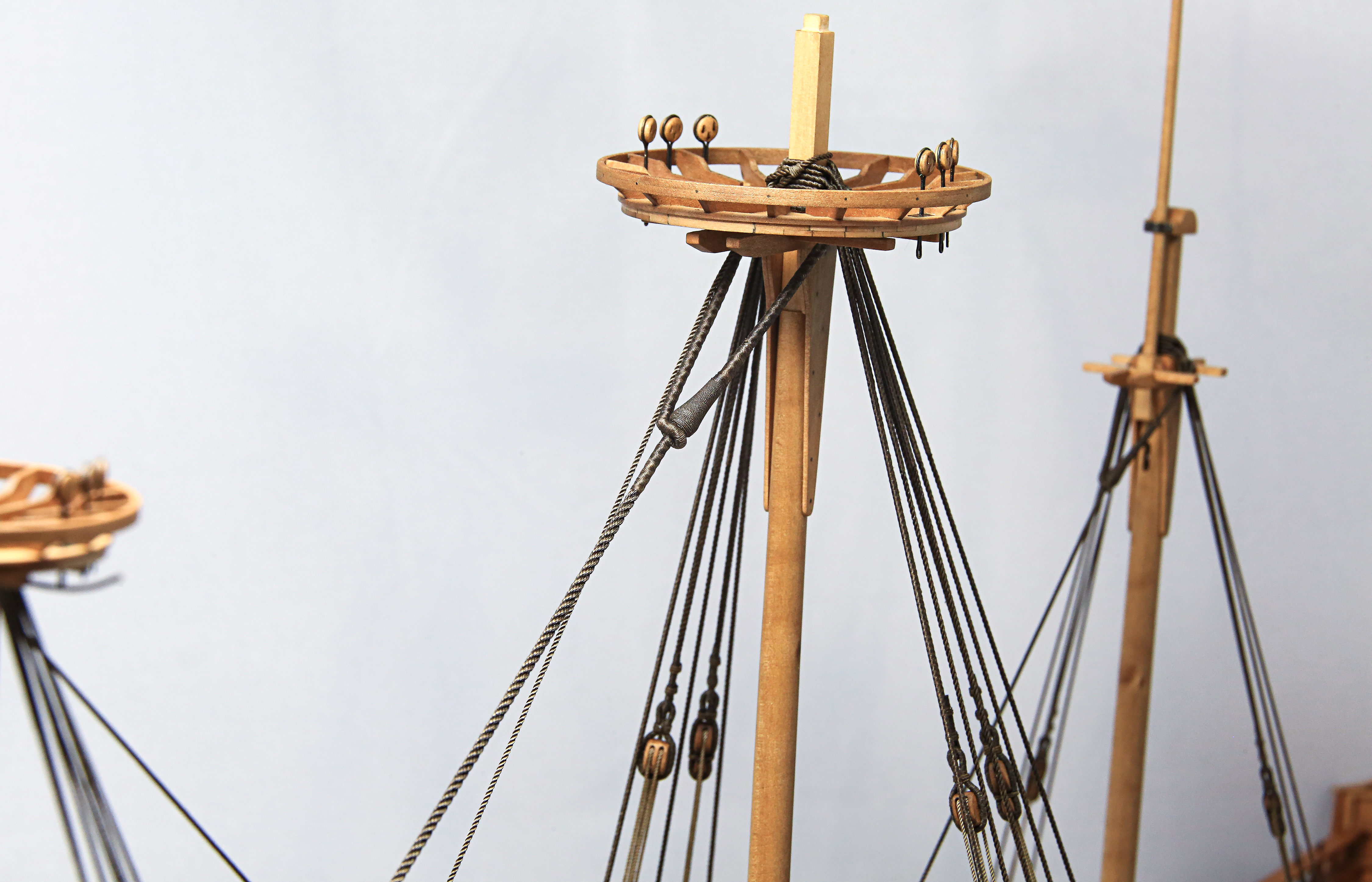 Chciałem udziergać tę charakterystyczną plecionkę ale tak mnie wkur.... mysz sztagu bezanmasztu, że odstąpiłem od tej czynności. Po prostu efekt mnie nie zadowolił i oplotłem je linką ok. 0,18mm. Druga sprawa, że myszy na sztagach grota i foka są większe i było już łatwiej i prezentowało się lepiej... ale nie chciałem aby oplot różnił się miedzy innymi myszami sztagów. Tak będą miały ten sam "wzór". Jak wyszło widać na fotkach. Może być... mogło być lepiej... ale cóż :lol:
