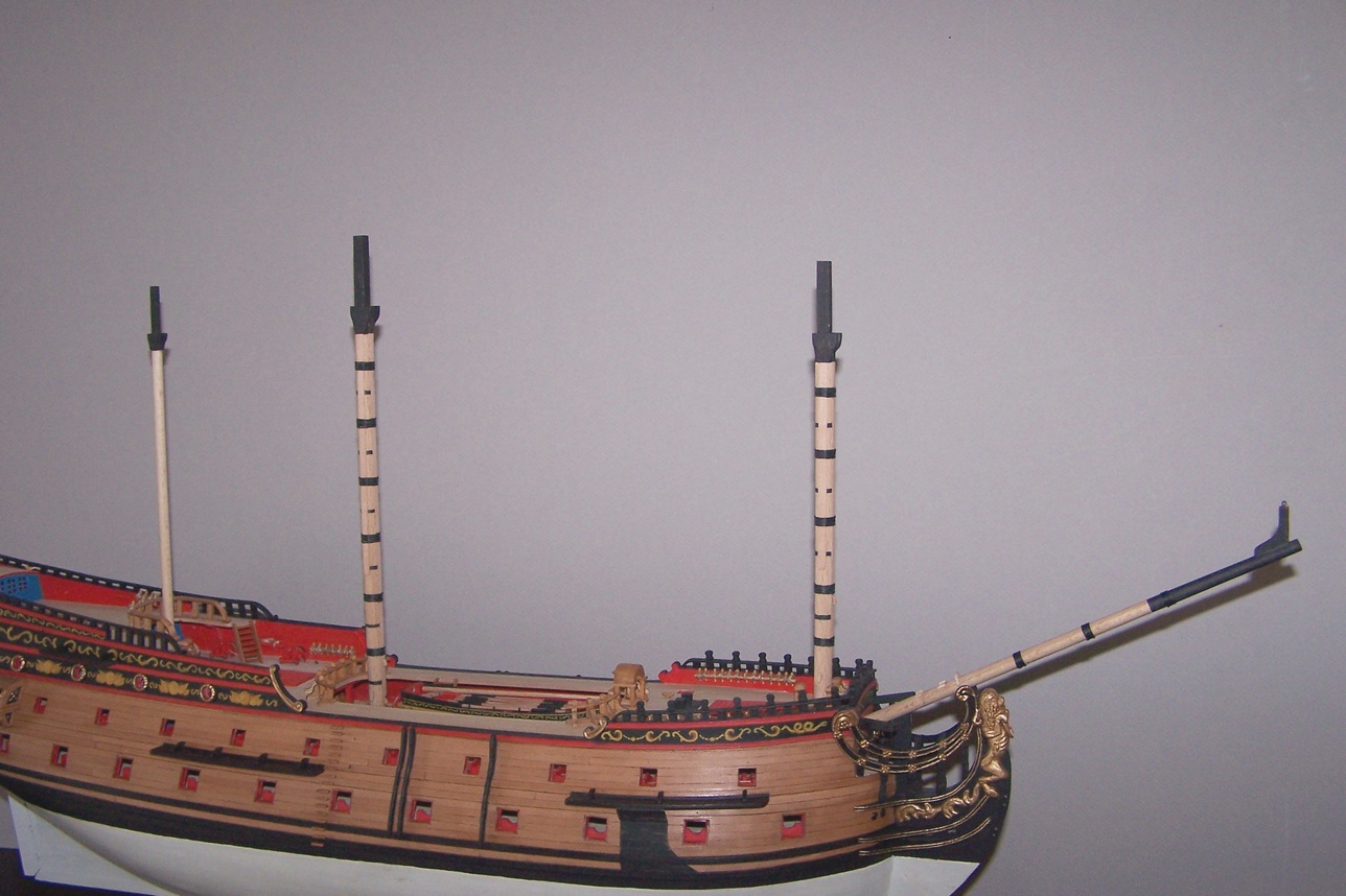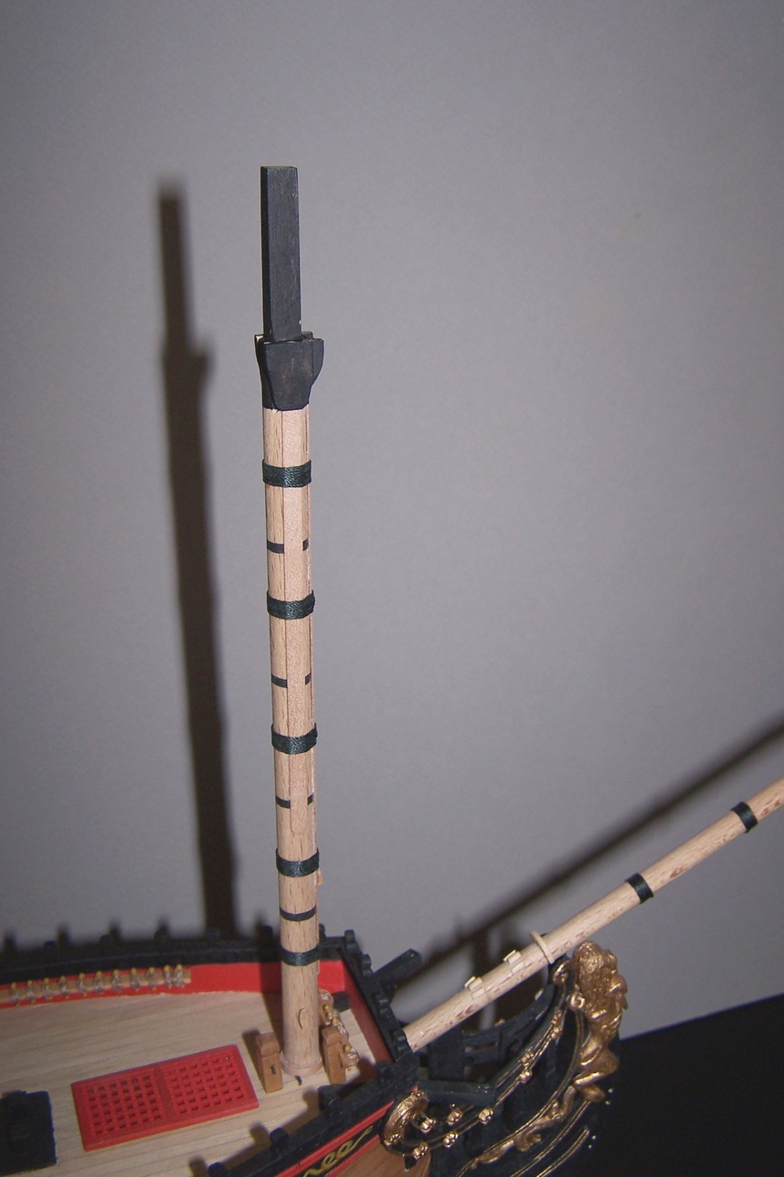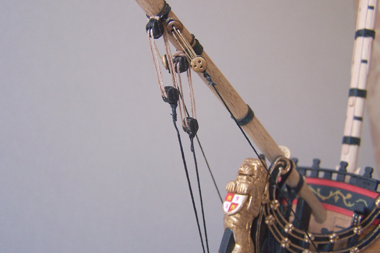 Uwiązałem bukszpryt (po hiszpańsku to będzie baupres czy jakoś tak :D )Mam pytanko: bloczki są maznięte na czarno, jufersy jak widać zostawiłem w naturalnym kolorze.Zastanawiam się czy też ich nie poczernić.Jak myślicie?