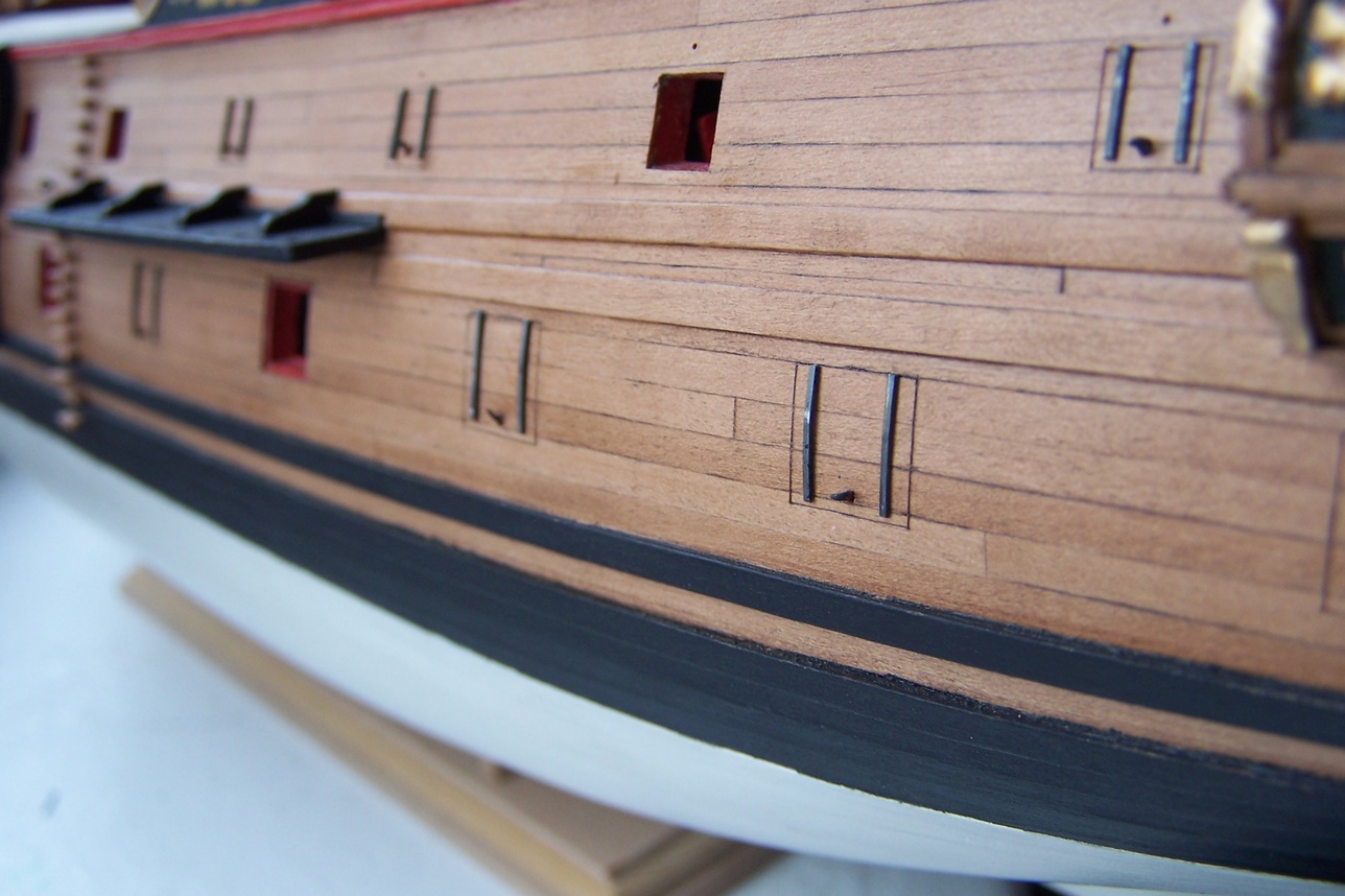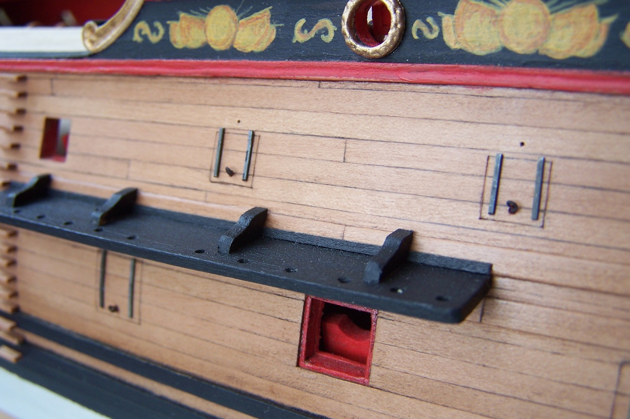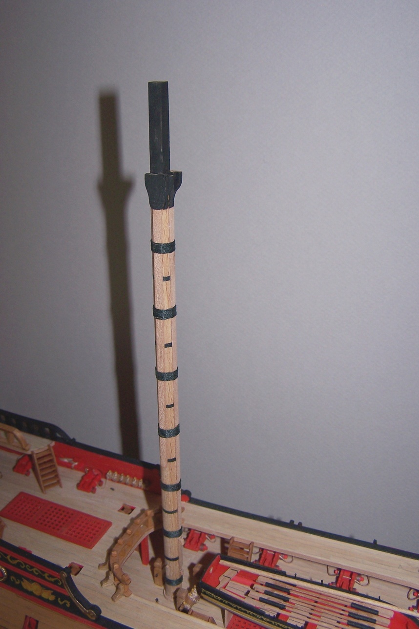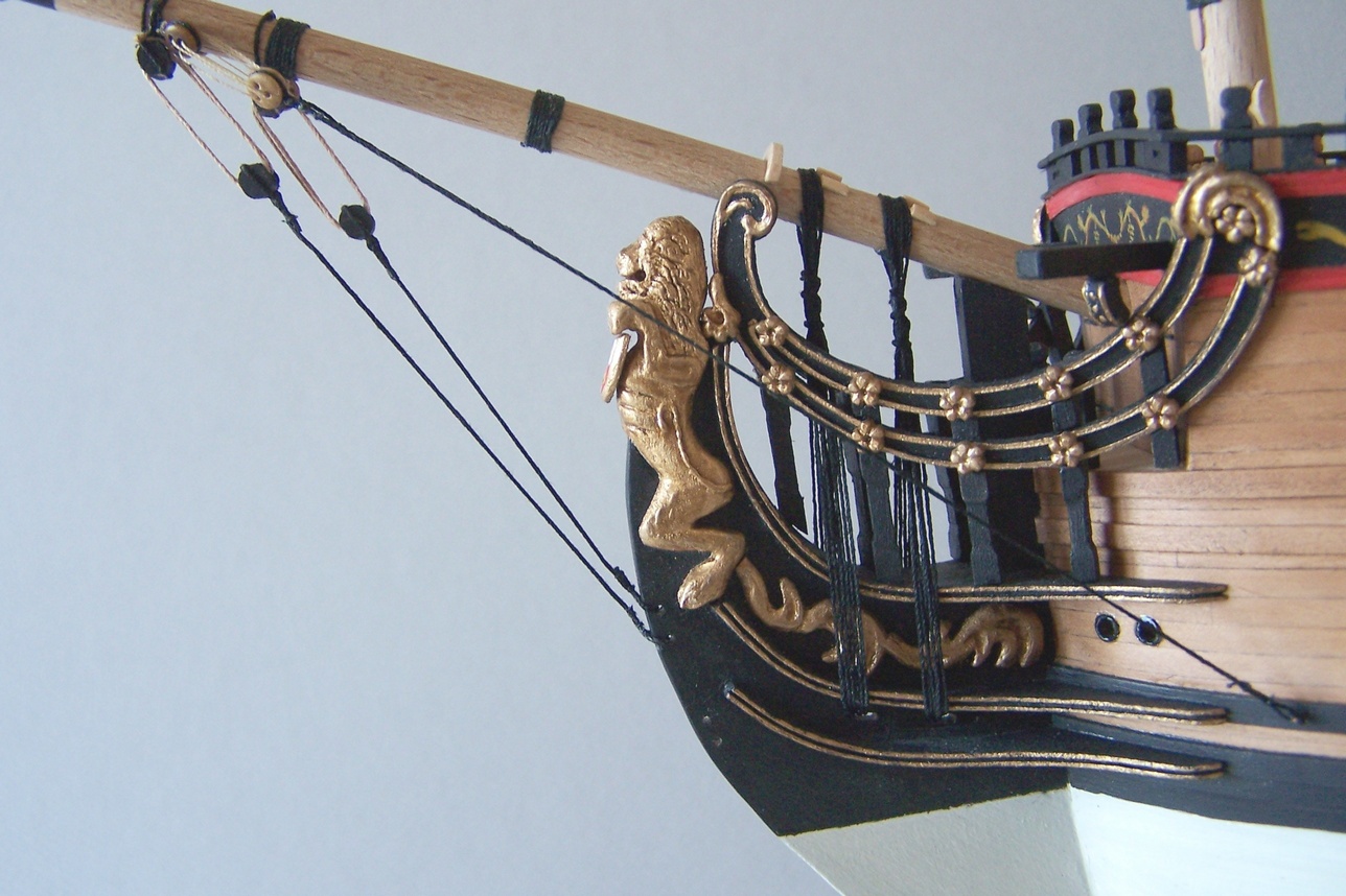 Uwiązałem bukszpryt (po hiszpańsku to będzie baupres czy jakoś tak :D )Mam pytanko: bloczki są maznięte na czarno, jufersy jak widać zostawiłem w naturalnym kolorze.Zastanawiam się czy też ich nie poczernić.Jak myślicie?
