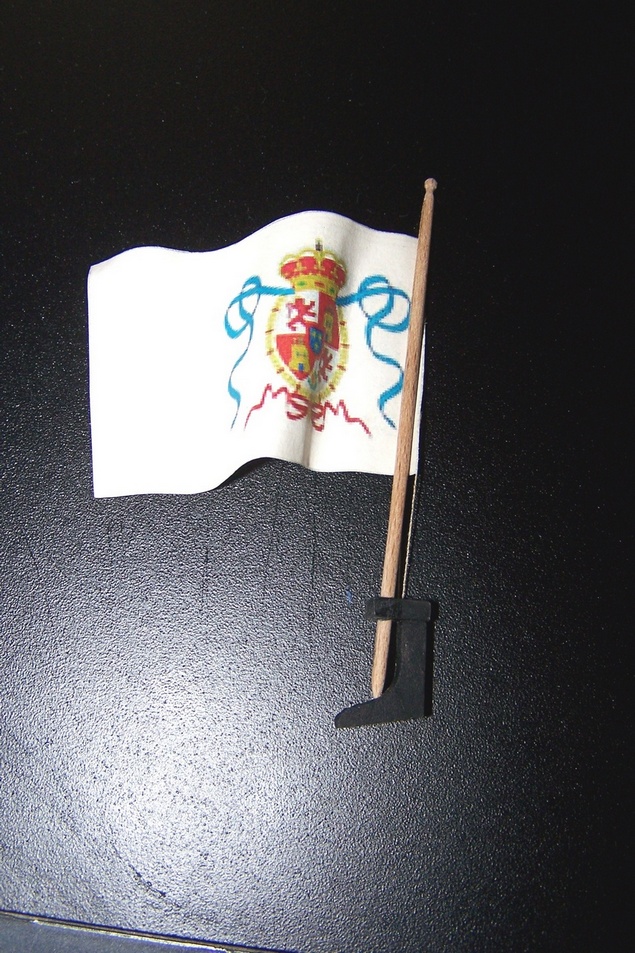 Ostatnie elementy.Barierki i flagsztok z flagą.Flaga zrobiona w najprostszy możliwy sposób.Wydrukowana normalnie i w lustrzanym odbiciu na zwykłym papierze i sklejona.Malowanie ręczne nie miało sensu ze względu na skomplikowany wzór i niewielkie rozmiary.