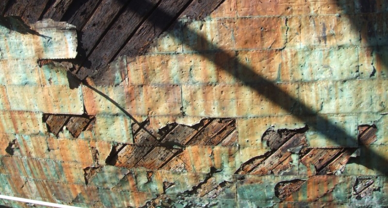 Siedzę nad drugą burtą- nic ciekawego nie wkleję (zwłaszcza przy moim aparacie), znalazłem kilka fotek tego jak wygląda oryginalne miedziowanie po jakimś czasie. Zastanawiam się czym to imitować w tej części która będzie widoczna nad falami.
