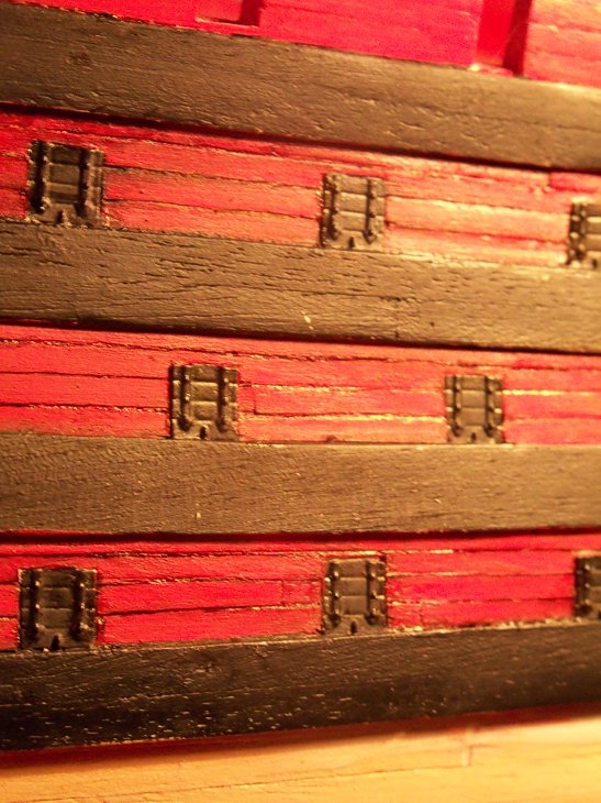 Zacząłem oklejanie burt 3 mm paskami forniru. Przy okazji wyszła kwestia furt- to co przyszło z zestawem jest bardzo "wygodne"- wkleja się i po sprawie, sęk w tym że da dziwna ramka z zawiasami nie dość że jest nieproporcjonalnie duża, to na dobitkę to jak wygląda nijak się ma do wyglądu rzeczywistej furty działowej (nie będę obrażał kolegów wklejaniem fotek Victory- koń jaki jest...). Z drugiej strony same pokrywy są niczego sobie. Jako że tak czy tak w modelu który robię planowałem zamknięte ( jakoś nie przypadł mi do gustu pomysł imitacji dział a przy braku dolnych pokładów nic innego nie wchodziłoby w grę), deskując burty chcę zmniejszyć istniejące gniazda i wkleić w nie zmodyfikowane pokrywy.