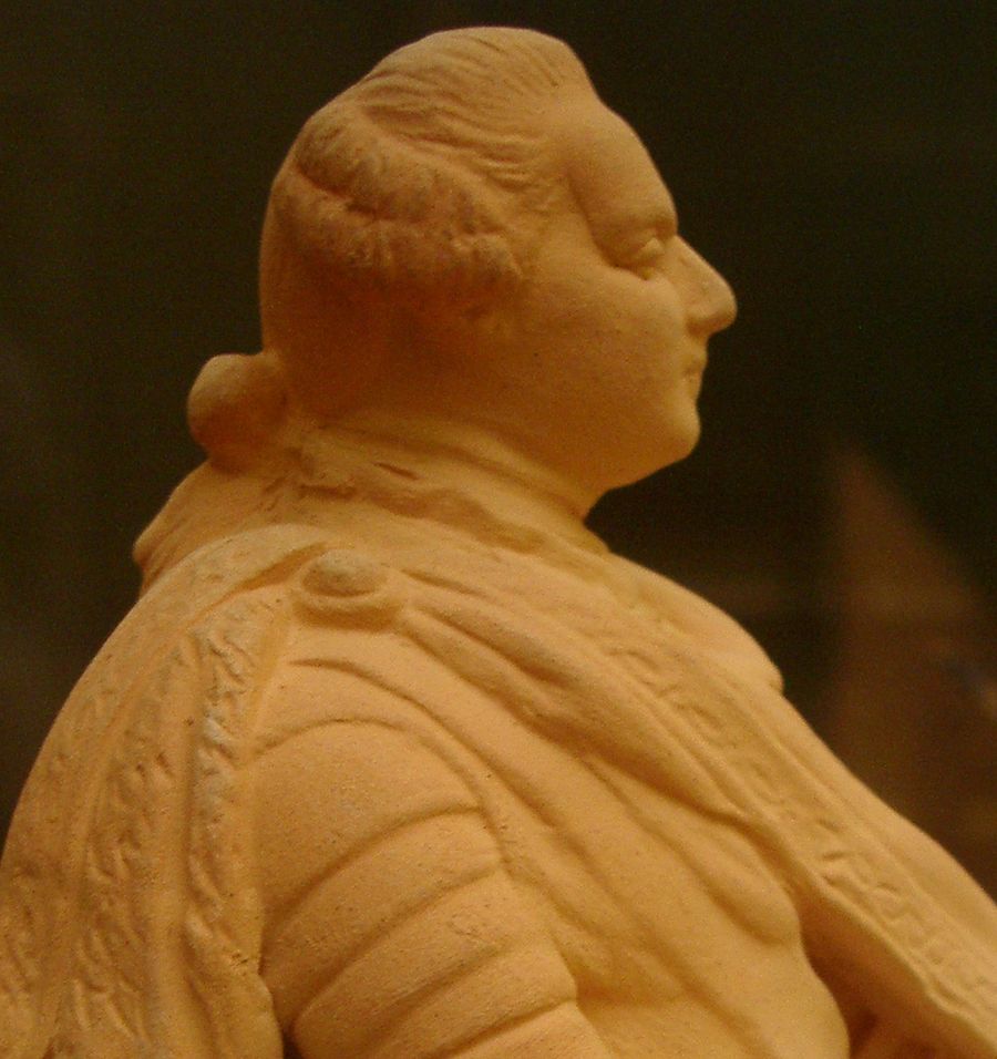 Ten model powstał (albo został przedstawiony królowi w 1759 lub 1760, czyli na początku panowania Karola III 1759 - 1788) w >> Galerii dałem kilka portretów "naszego bohatera", żeby podpatrzeć z jakimi atrybutami był portretowany. Najbardziej interesuje nas wizerunek z 1761 i 1763 roku, jako najbliższy daty powstania modelu. Widać "Order Złotego Runa" i na innych popiersiach łańcuch od tegoż, (więc łańcuch dobrze czytamy, bo ja zresztą też). Z lewej strony czytam tasiemki od kokardy (też takie widać na monetach).