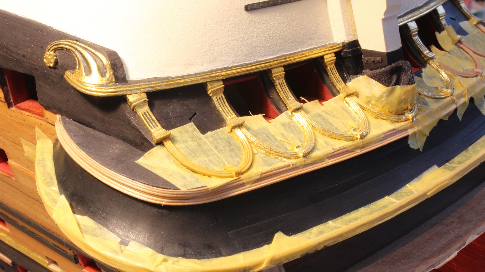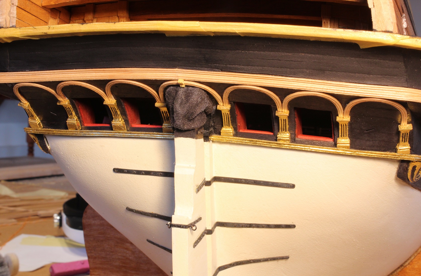 Tak z przerwami na odwiedzanie, jedzenie , popijanie przed- i świąteczne coś powoli dłubałem. Takie tam "sukiennice" na nawisie pawęży strugam.