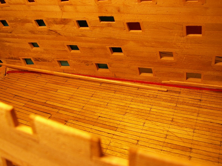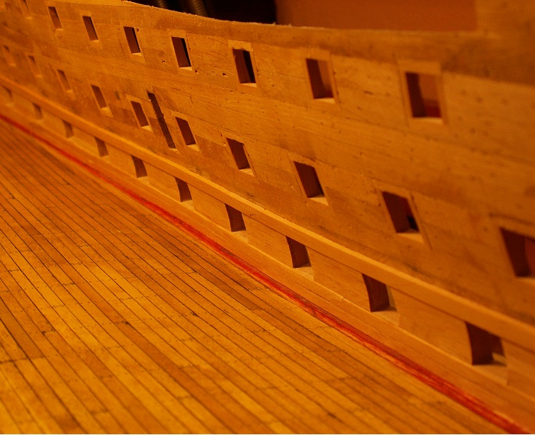 Mogę powiedzieć, że lewą burtę głównego pokładu bateryjnego mam zrobioną. Ważne, że wiem na co mam zwrócić uwagę, jak będę robić wewnętrzne poszycie w widocznych miejscach. Proporcje belek poszycia wyszył mi bardzo dobrze, łącznie z górną belką (upper deck clamp), która w przekroju przypomina kształt trapezu.