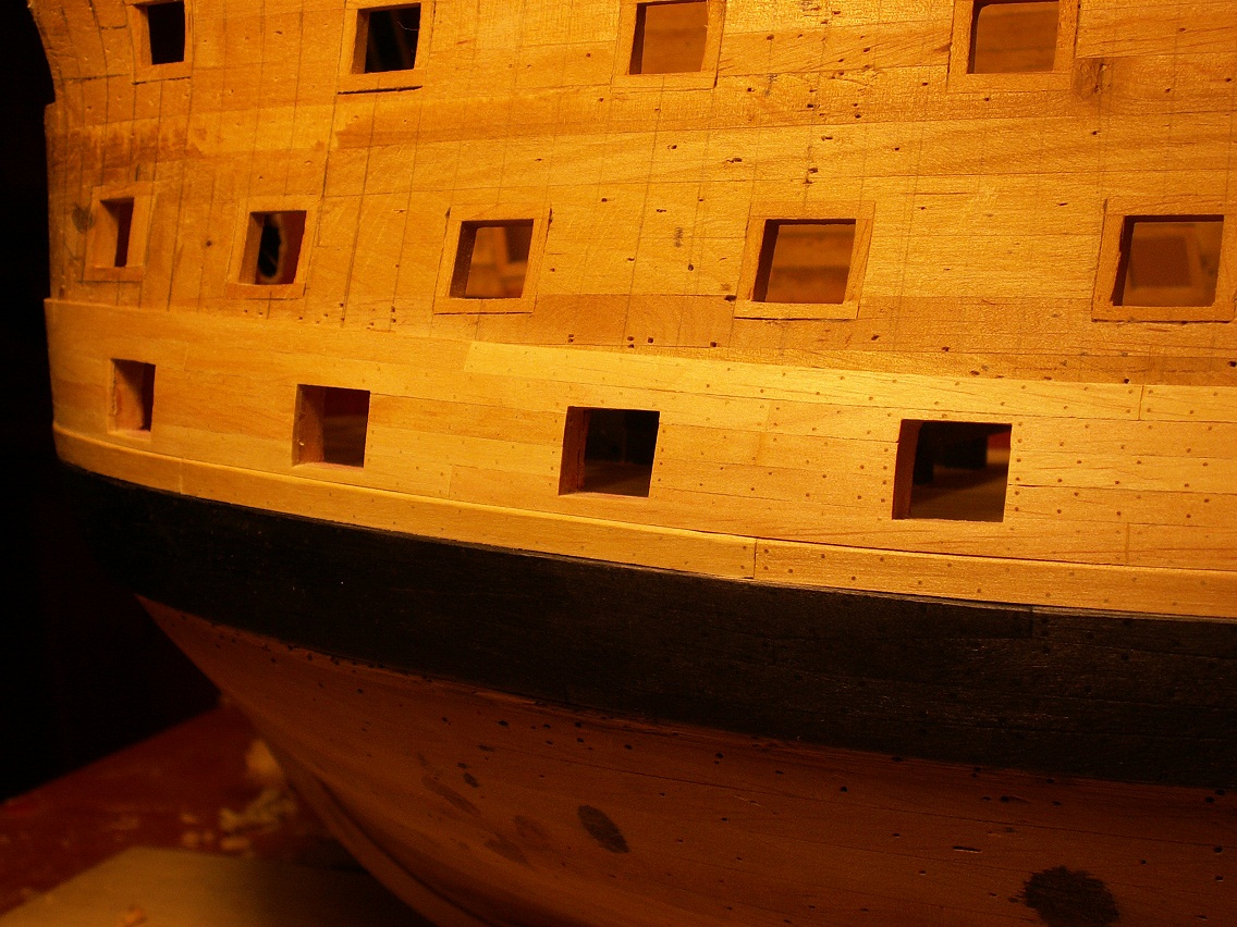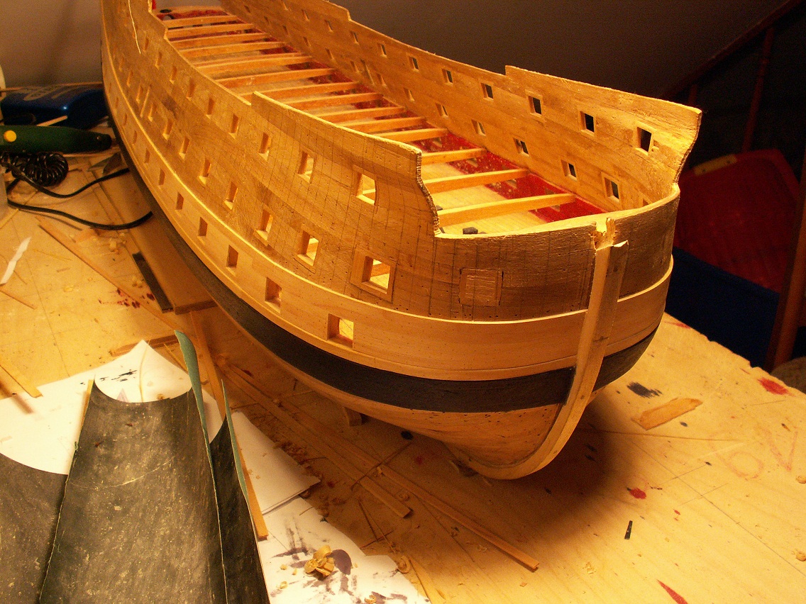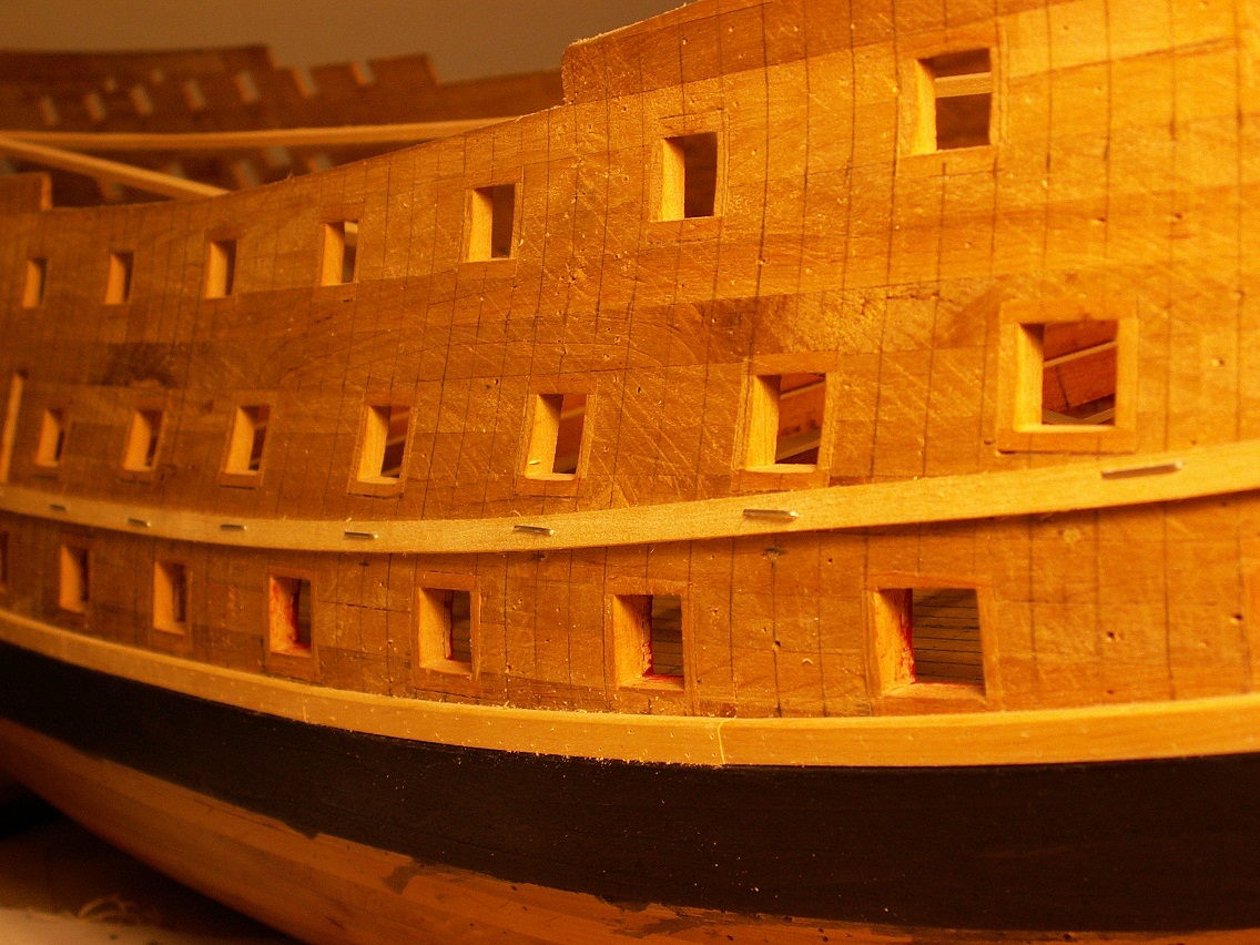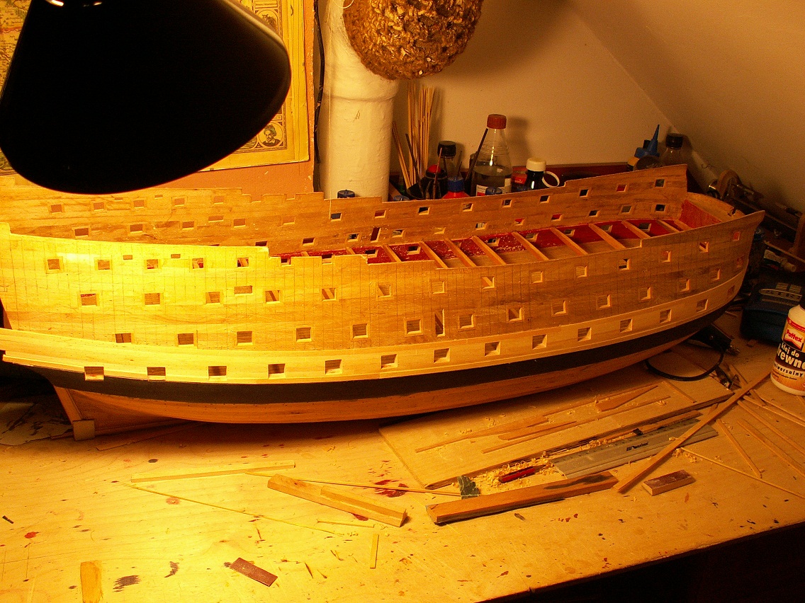 Holendrzy się zbroją, Hiszpanie się zbroją, Francuzy też się zbroją i to jeszcze bardziej, Wenecjanie prawie pływają...w końcu i ja się nieco pozbroiłem. Mam gotowy na obu burtach jeden z passów cieńszego poszycia, stan taki jak poniżej na fotkach