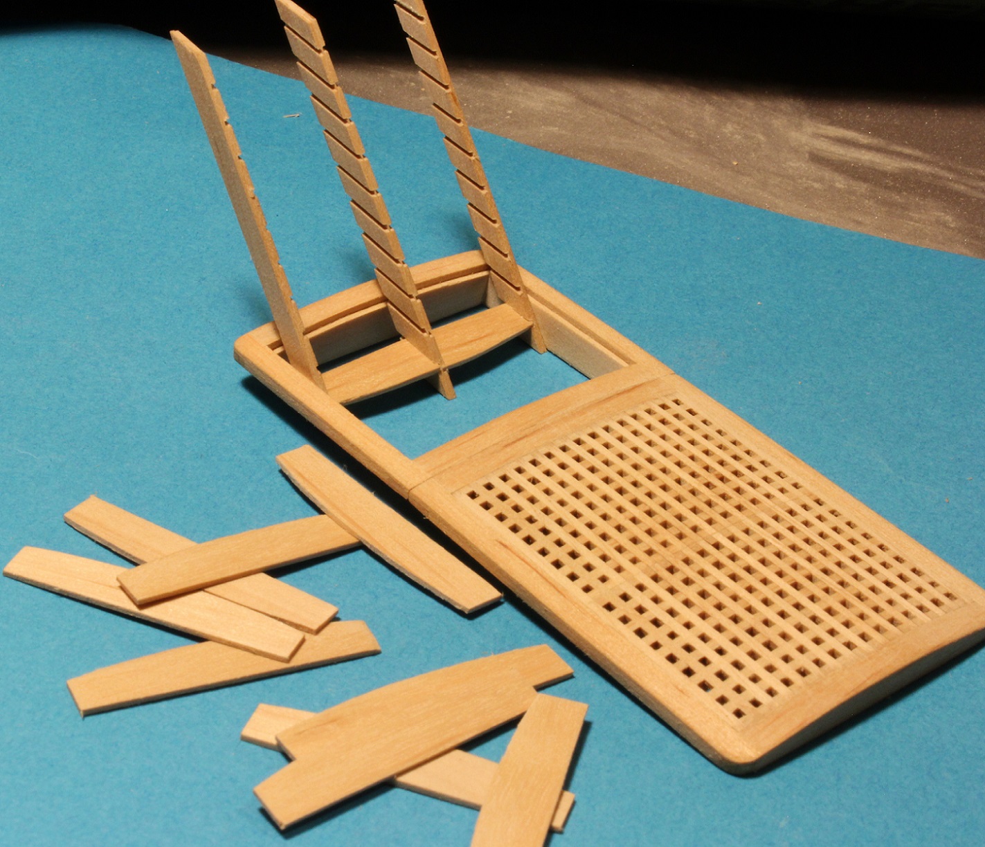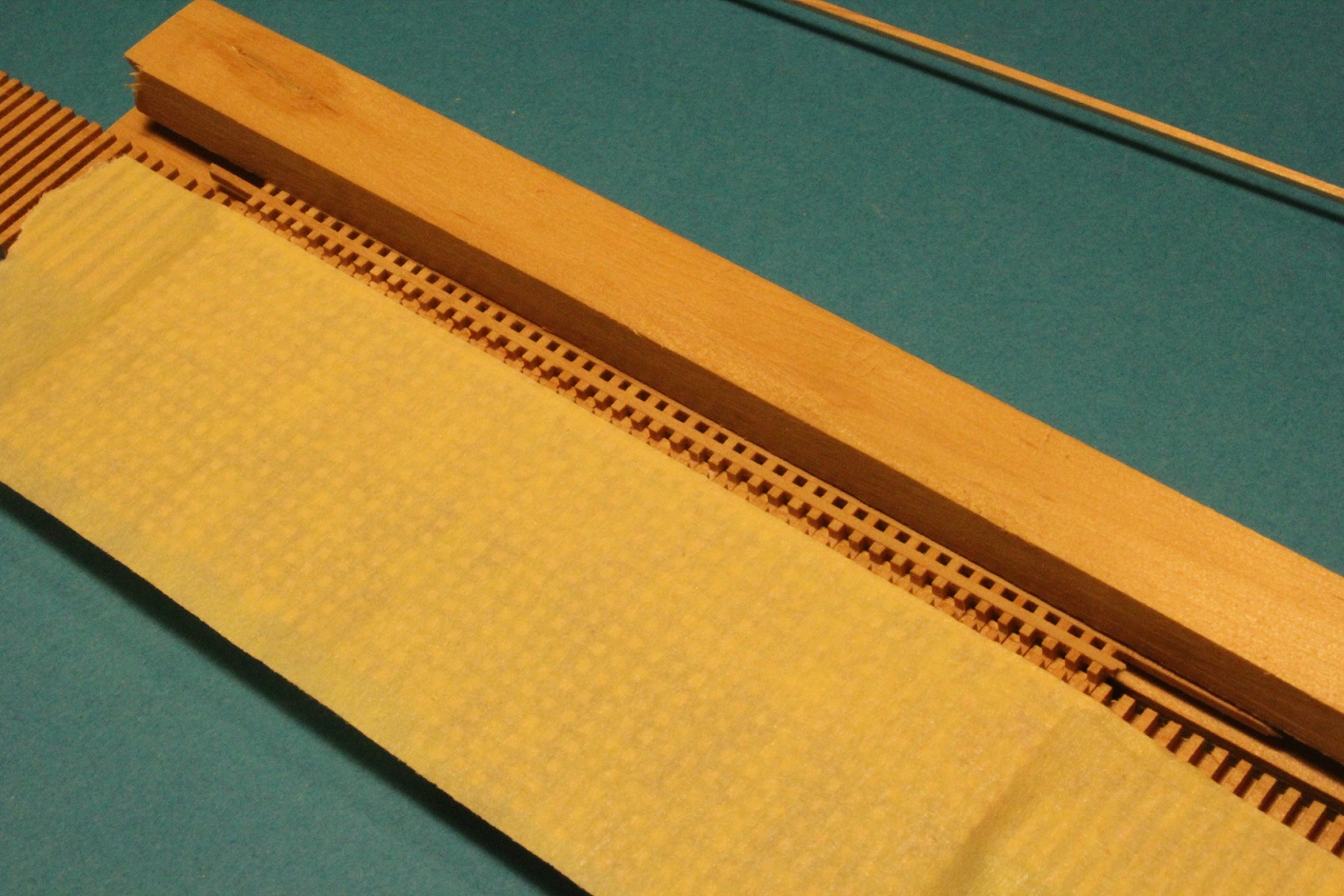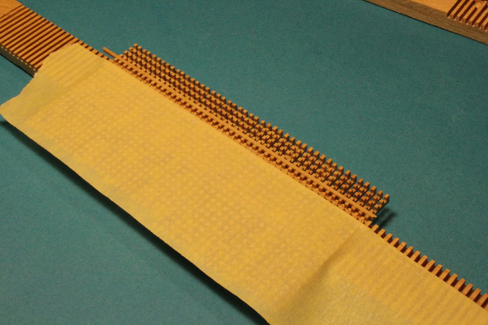 Wydziergałem surowe kawałki gretingu. Zostaje je jeszcze lekko wyoblić no i poprzycinać na wymiar. Na tę chwilę leżą pokład wyżej nad ich miejscem docelowym. Dalszy proces robienia gretingów polegał na dociskaniu "deską" w "deskę". Dawało mi ta w miarę równe osadzanie listew wzdłużnych. Najgorzej było z nanoszeniem kleju. To jet gorsze niż kołkowanie;)