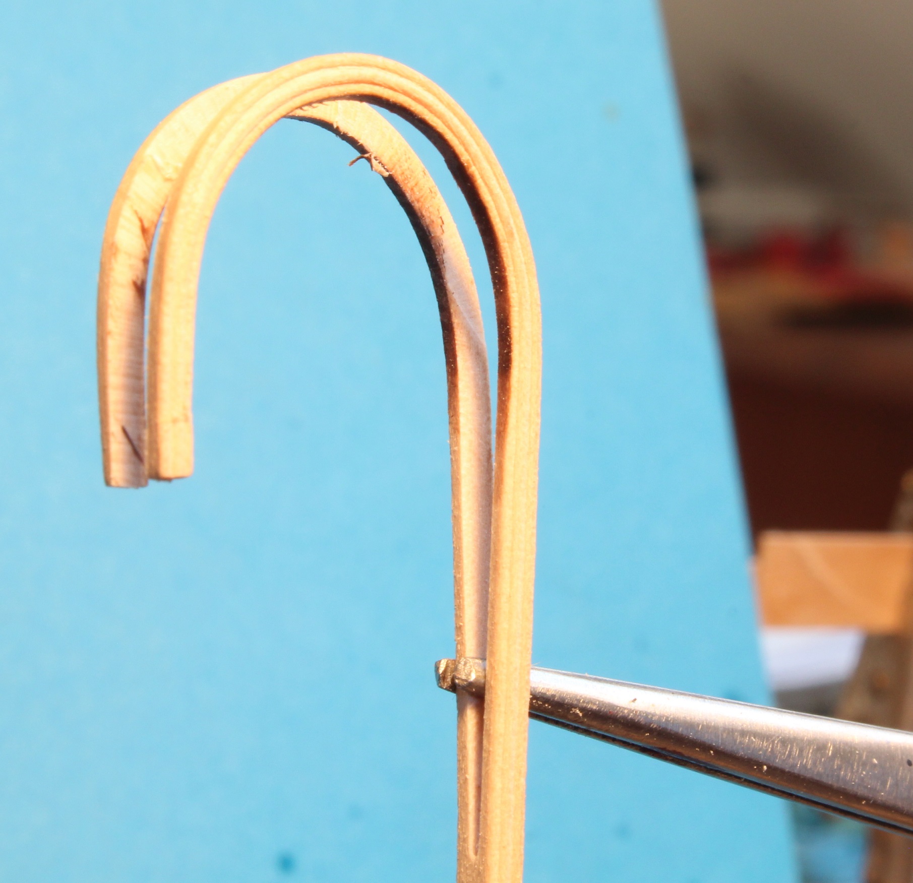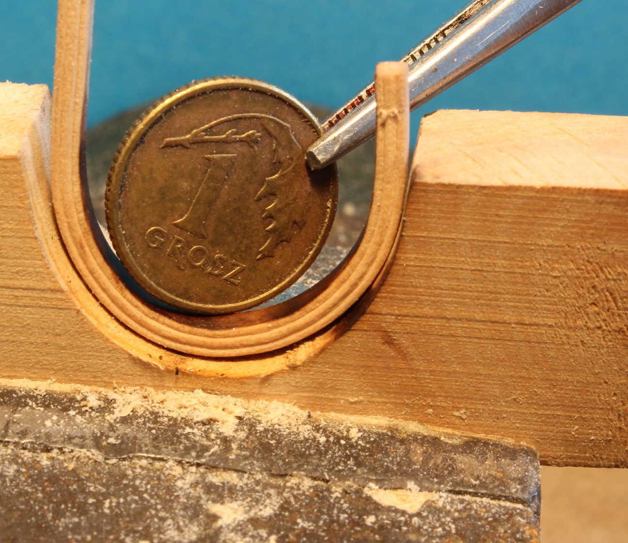 Listewka to grusz wyginana na mokro po ugotowaniu kilka minut we wrzątku. Udało mi się wygiąć w łuk o dość małym promieniu. Łuk od wewnątrz odpowiada (porównywalny jest) średnicy jednogroszówki.