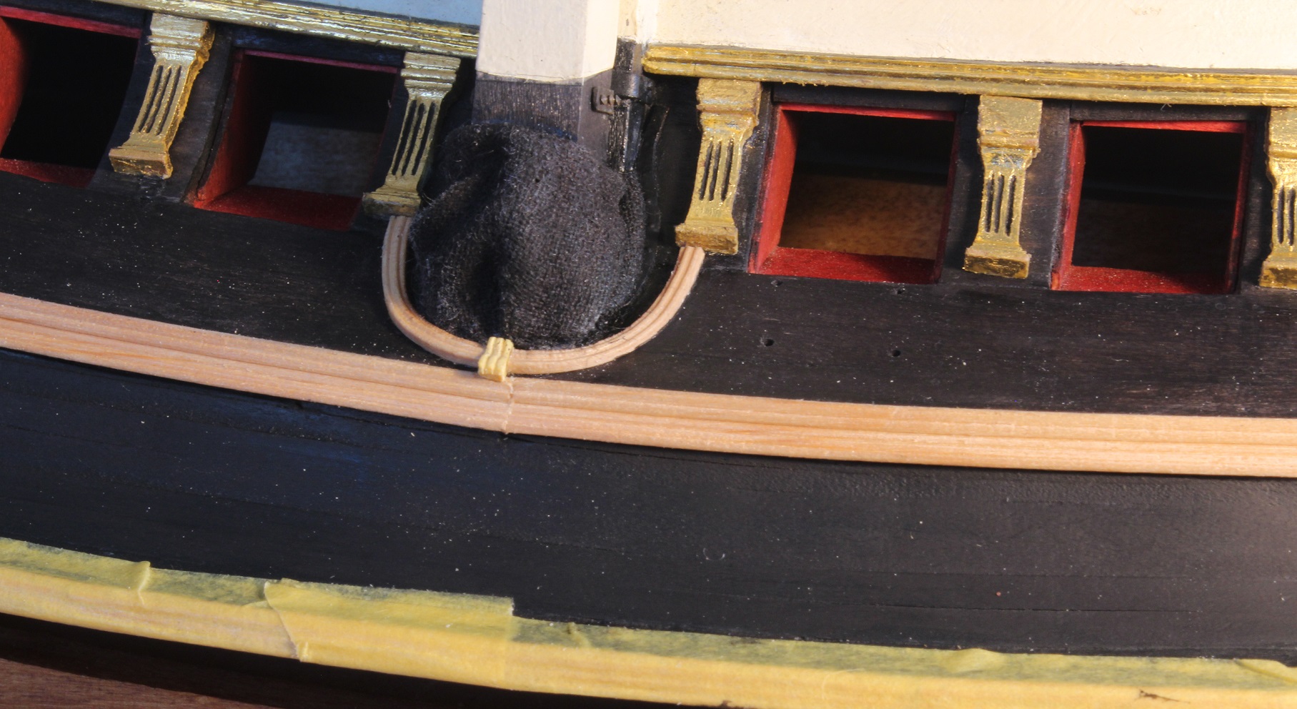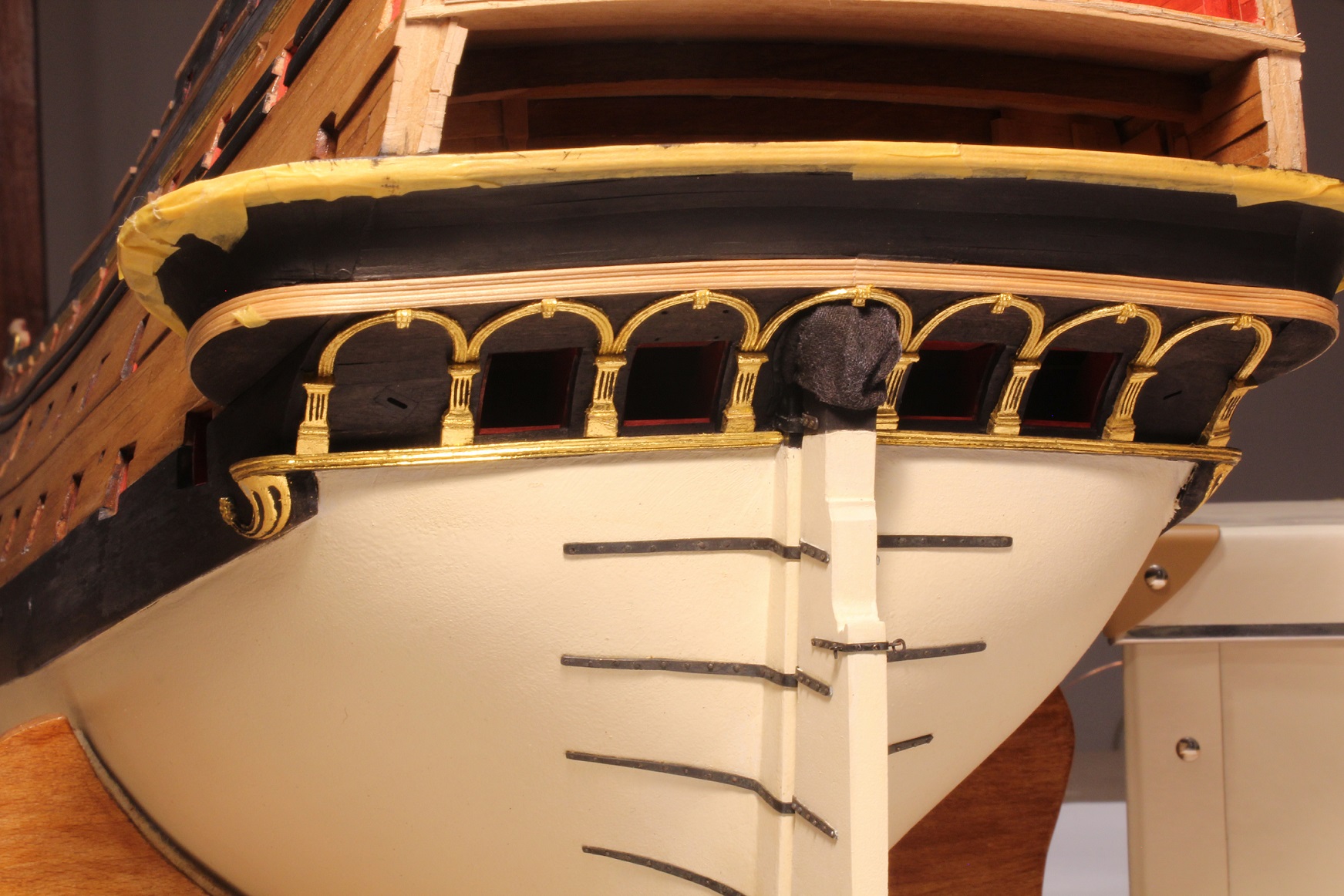 Tak z przerwami na odwiedzanie, jedzenie , popijanie przed- i świąteczne coś powoli dłubałem. Takie tam "sukiennice" na nawisie pawęży strugam.