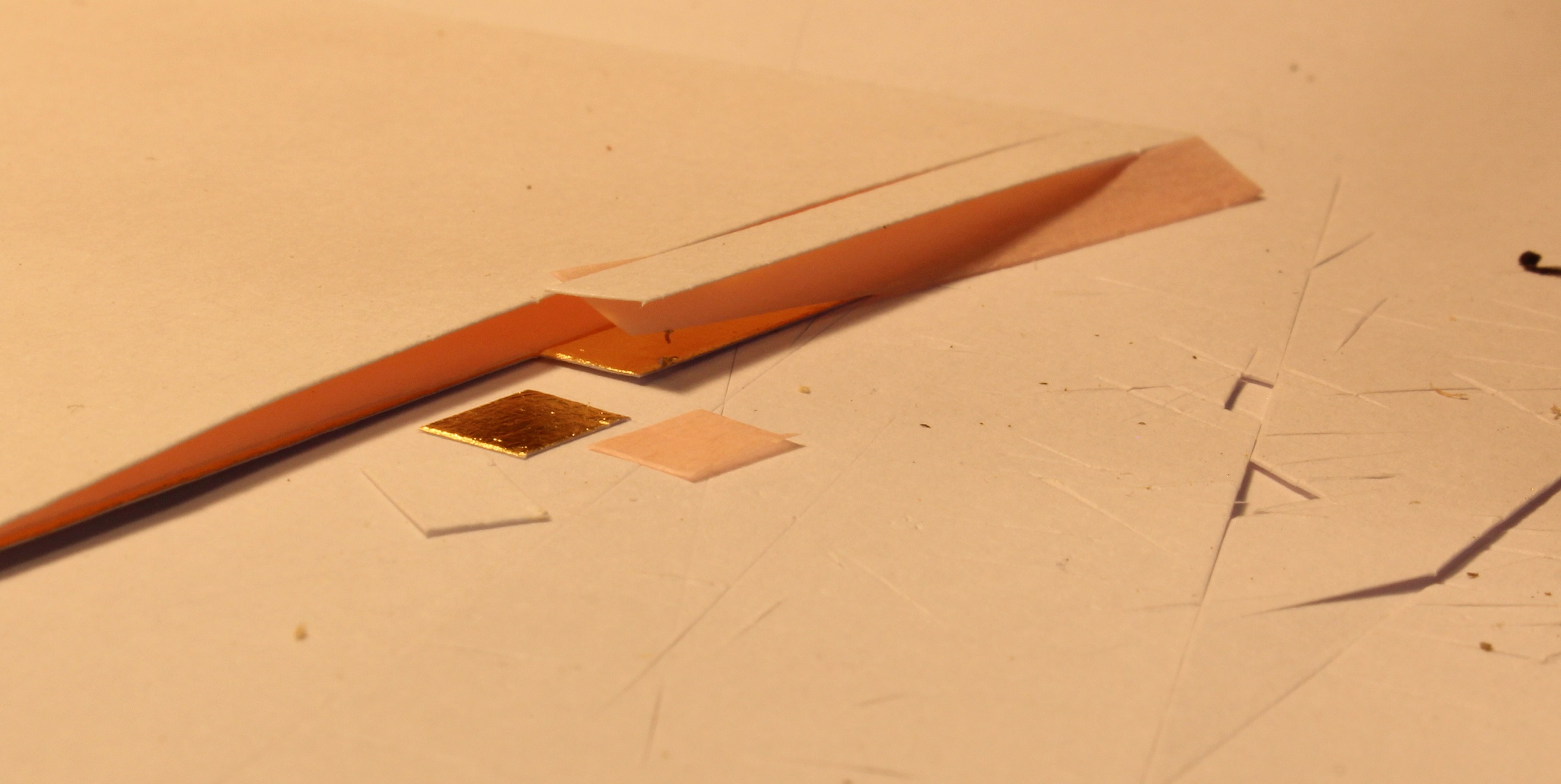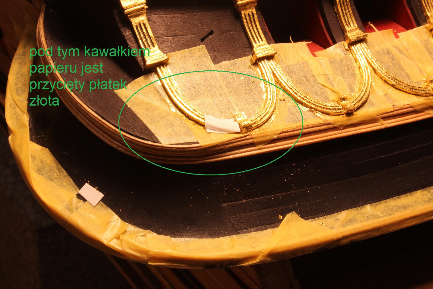 Witaj. Cięcie i nanoszenie jest największym problemem .Zamiast papieru od drukarki stosuję bardzo cienki papier jak papierosowy .Tnę go na format złota nakładam na płatek tak ze znajduję się pomiędzy dwoma papierkami .Potem przy pomocy metalowej linii i skalpela tnę na dowolne wymiary .Przenoszę taką kanapkę pincetą .Jest też płatek jakby przyklejony do papierka .Dostałem kilka arkusików i do pracy na modelu jest idealny .Można go dowolnie przemieszczać i nie odpada a po dociśnięciu pozostaje na detalu .Gdzie można kupić nie mam pojęcia .Detali złoconych na modelu nie izoluję taśmą tylko starannie smaruję klejem i aktywatorem .Złoto bez kleju odpada .Detale z drewna należy mocno impregnować i polerować .Nie zawsze mi wychodzi ale widać różnicę Źle zaimpregnowane jest matowe . Adam powodzenia .Z czasem nabierzesz wprawy .Pozdr.R