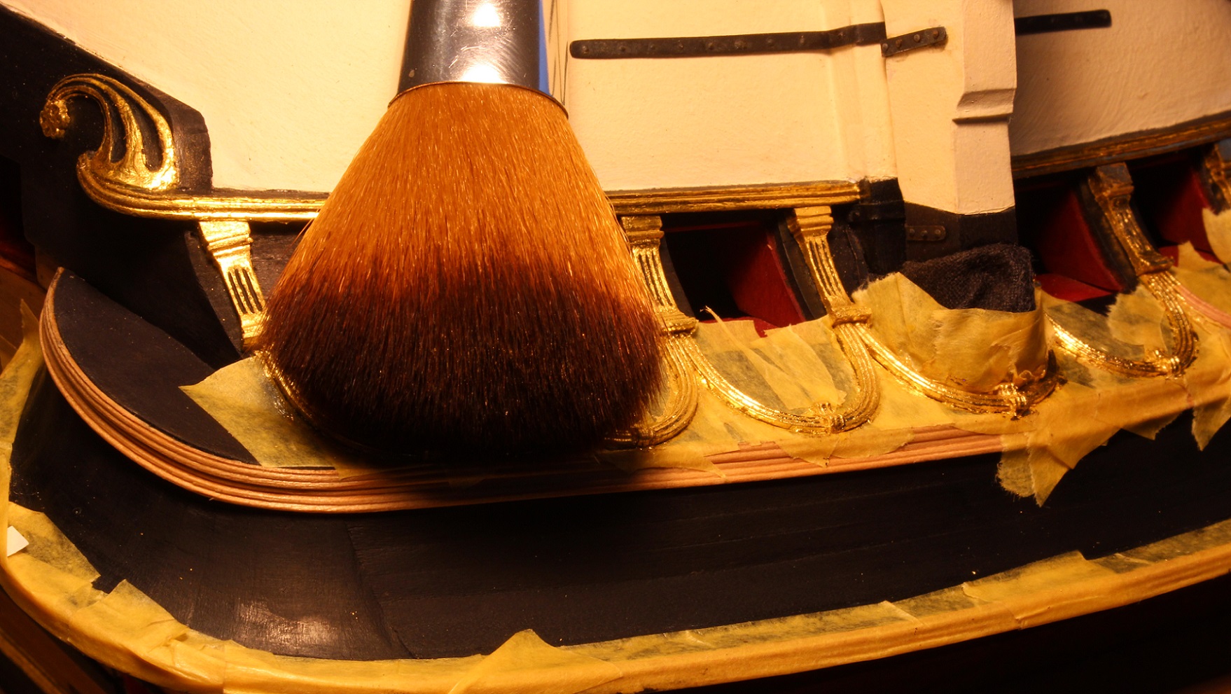 5) na koniec całość pozłoconych elementów dociskam pędzlem kosmetycznym do pudru kupionym w sklepie spożywczym, ten w plastycznym 3 razy droższy jest