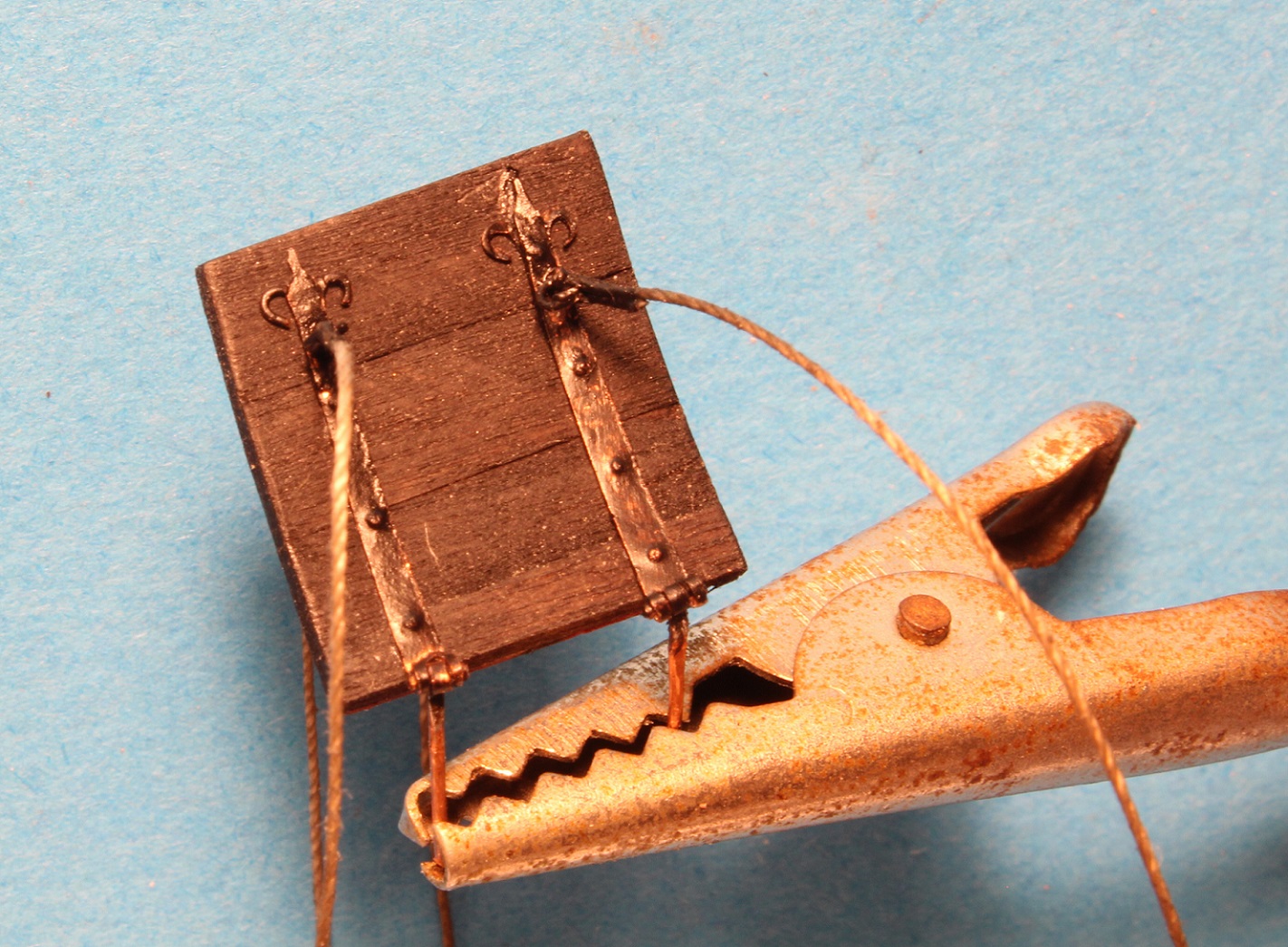 A na tą chwilę dłubałem zawiasy. Ruchome zrobiłem, łatwo się je pod odpowiednim katem ustawia przy burcie. Trochę mi z tym schodzi. Dopatrzyłem się na fotkach gotowych wersji RW, ze kowal od okuć miał fantazję- wąsy robił przy każdej odkuwce zawiasu. Ja je musiałem wlutować. Jakoś wyszło. Pierwsze dwie klapy furt wiszą