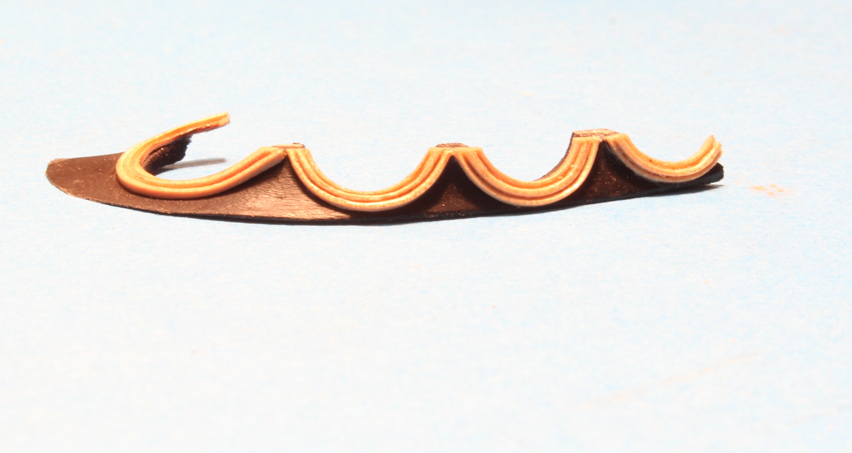 4) listwy ozdobne wyginam na sucho z trzech niezależnych pasków wykonanych z gruszy, grubość każdego paska około 0,7-0,8 mm; gnie się idealnie na lutownicy. Niestety muszę to robić bezpośrednio na grocie. Łuki są o bardzo małym promieniu