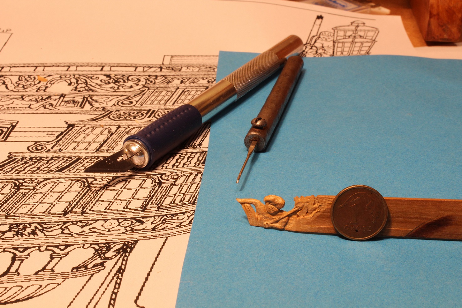 W końcu do stoczni mnie przygnały chęci. Dziś męczyłem gościa z "baziń". W gruszce go dłubałem. Coś tam wyszło. Gęba mnie się jego nie podoba. No ale, że jest to małe- mniejsze od jednogroszówki, raczej nie zrobię lepiej. Teraz schnie na nim kapon. Jeszcze takie same straszydło na drugą burtę muszę wydłubać