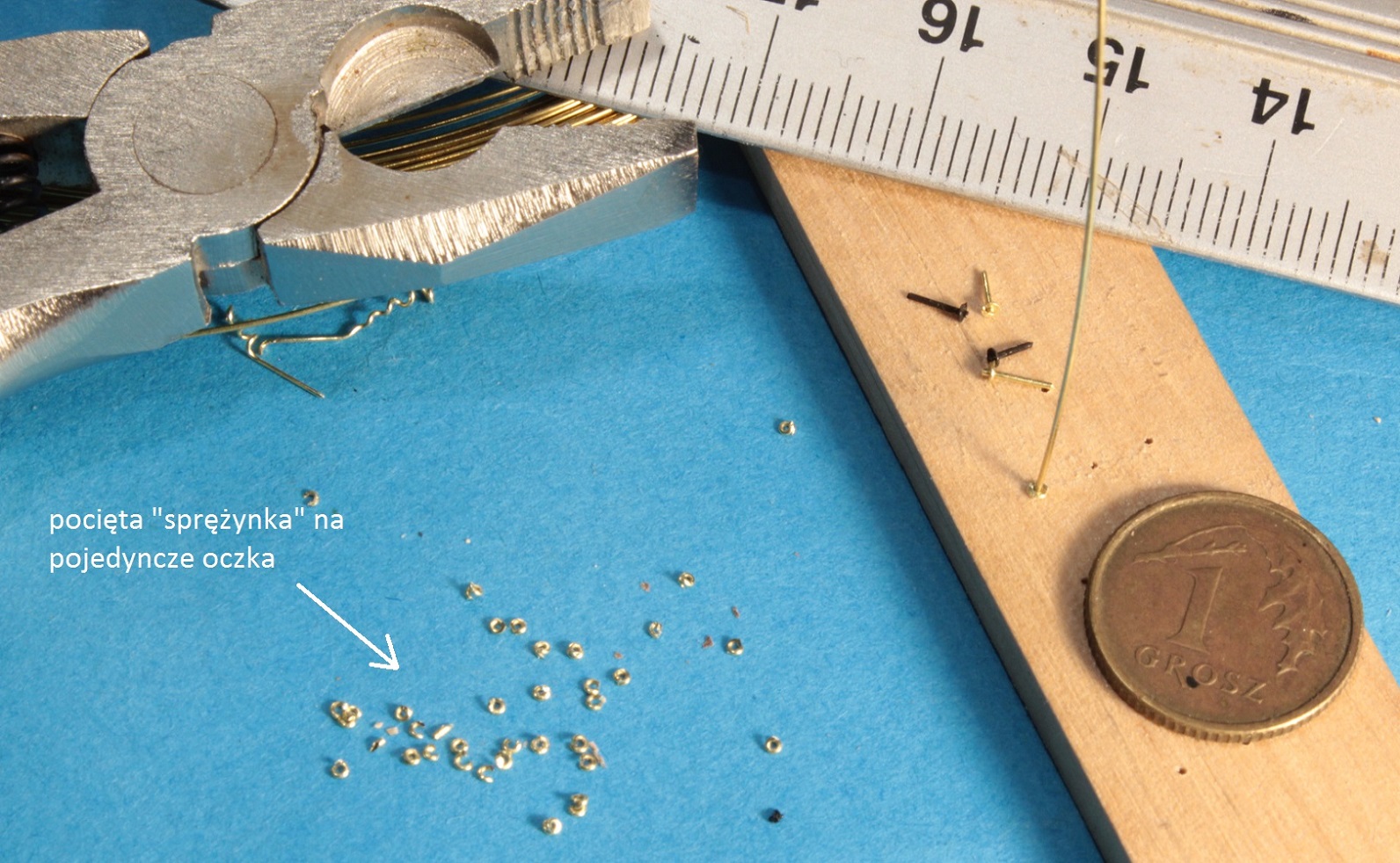 Na miedziany drut nawijam mosiężny drut 0,3 mm. Powstaje coś w rodzaju sprężyny. Którą rozcinam na pojedyncze oczka