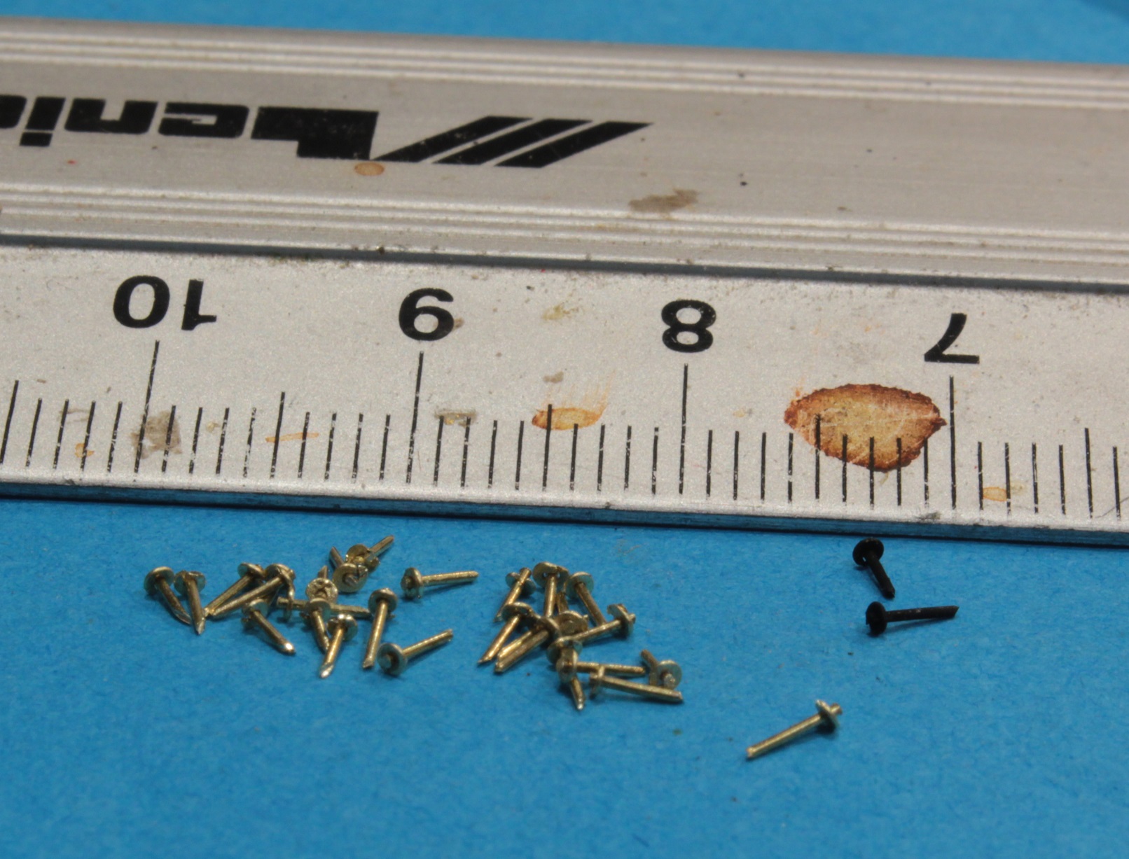 W końcu wymyśliłem sposób na imitację długich szpil mocujących talie lawet. Końcówki tych szpil są widoczne na burtach przy furtach. Zrobiłem je z drutu mosiężnego 0,3 mm i 0,4 mm. Z cieńszego robię podkładki a z grubszego szpilę.