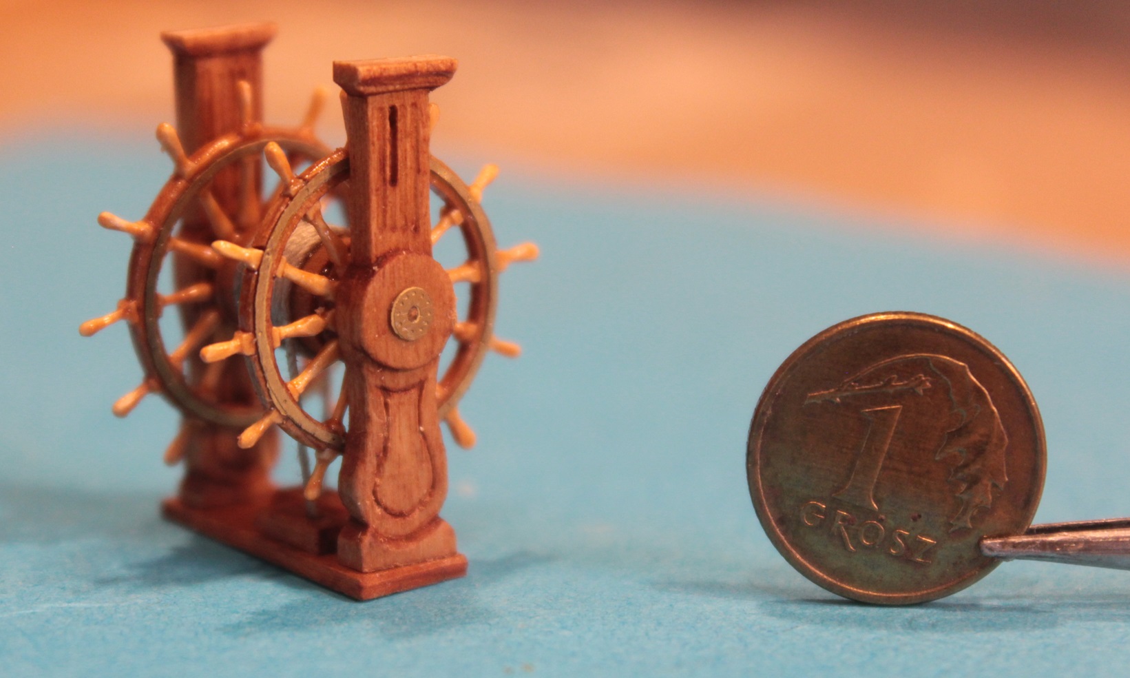 Eksperymentalny pomysł wykonania koła sterowego zdał egzamin. Obręcz to nawinięta cienka namoczona w bejcy olchowa listwa.