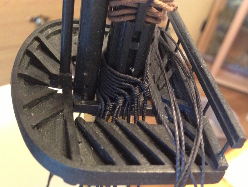 Zaczęły się sznureczki. Na pierwszy ogień poszły wanty fokmasztu. Wydawnictwo proponuje wiązanie węzłem płaskim ja spróbowałem naśladować oryginał. Troche to trudne przy zbudowanym maszcie, ale jakoś sobie poradziłem:
