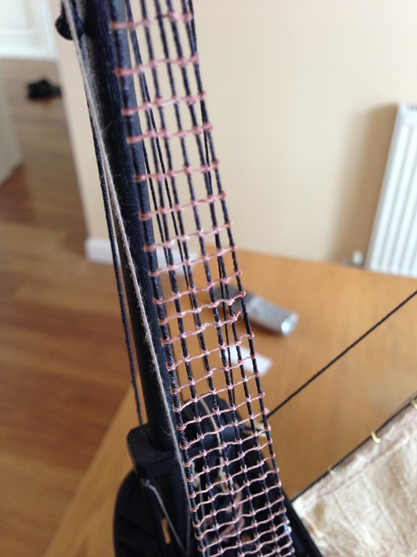 następnie kilkakrotnie owijałem wanty i owijkę dopychałem pensetą w stronę masztu jednocześnie napinając nitkę. Dlatego wanty "przykrokoldykowane " do podstawy