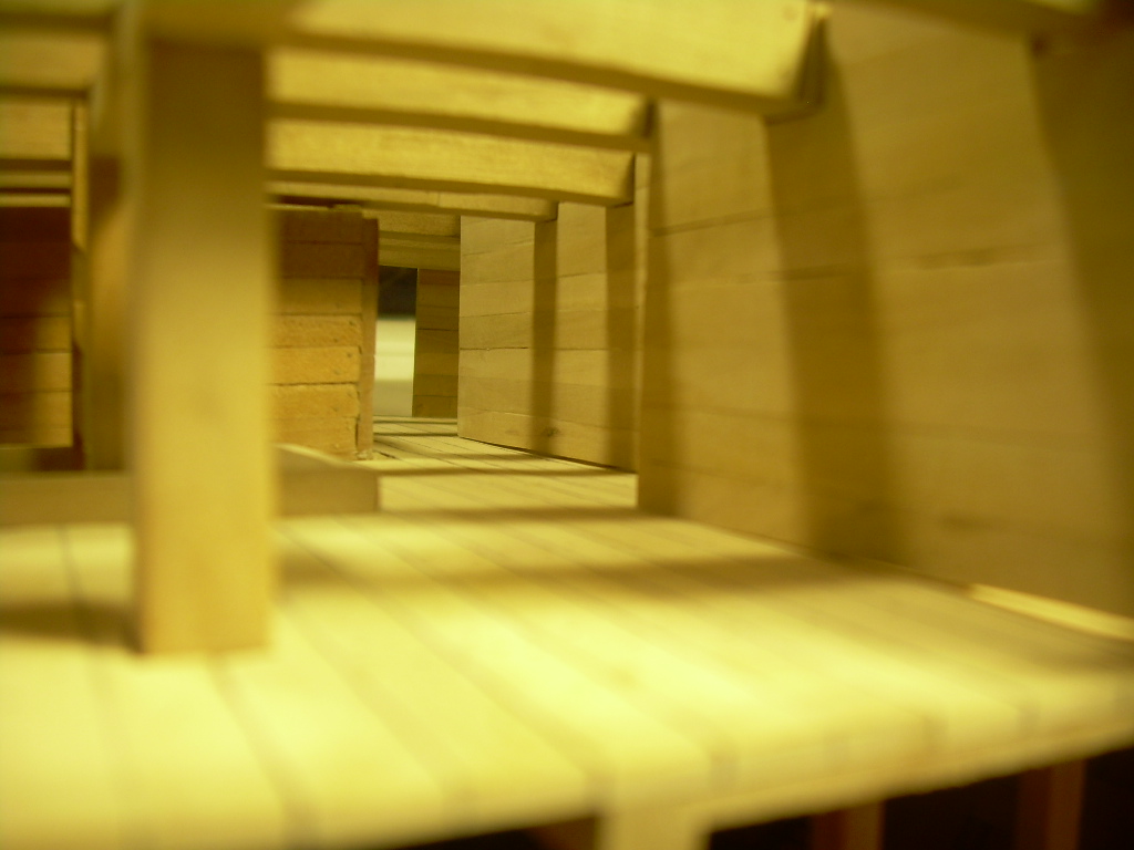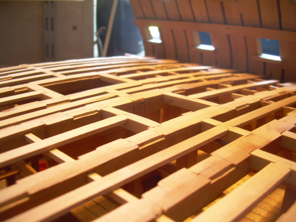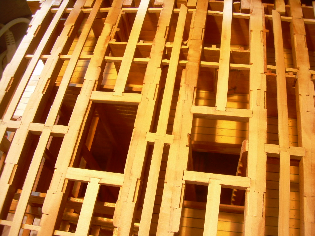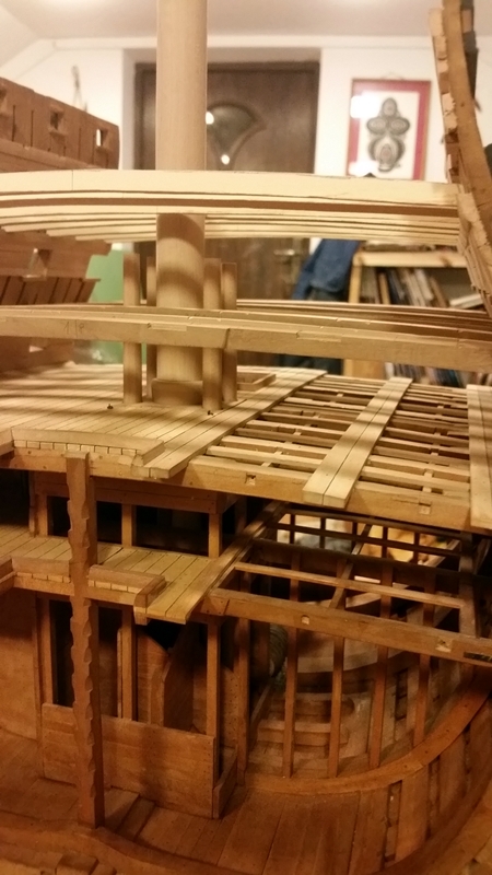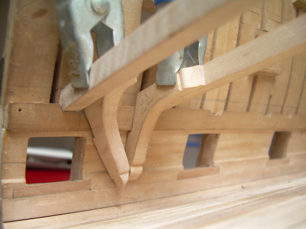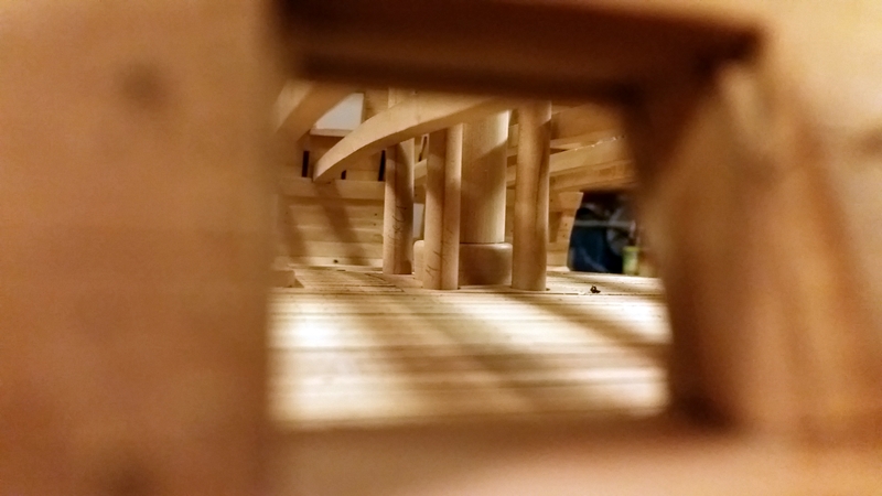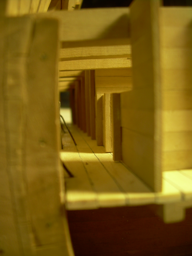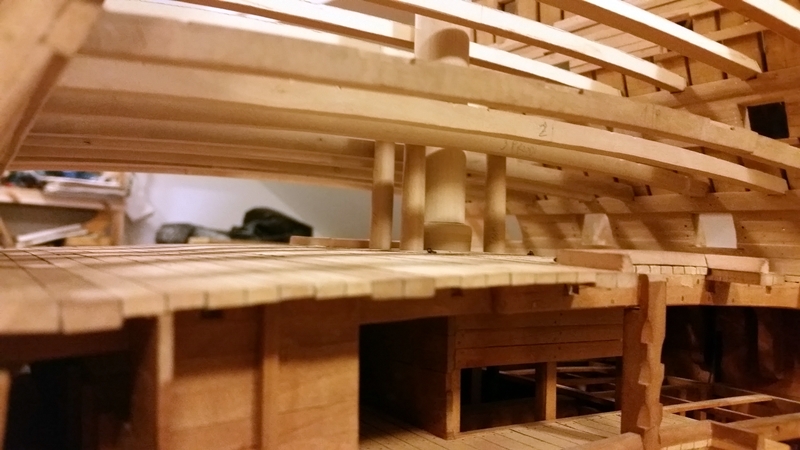 Główny pokład działowy jest skończony i można robić armaty i wyposażenie. Doszedłem jednak do wniosku, że musze przygotować konstrukcję kolejnych pokładów. Jak widać na zdjęciach wsporniki wymagają dużo dopasowywania.