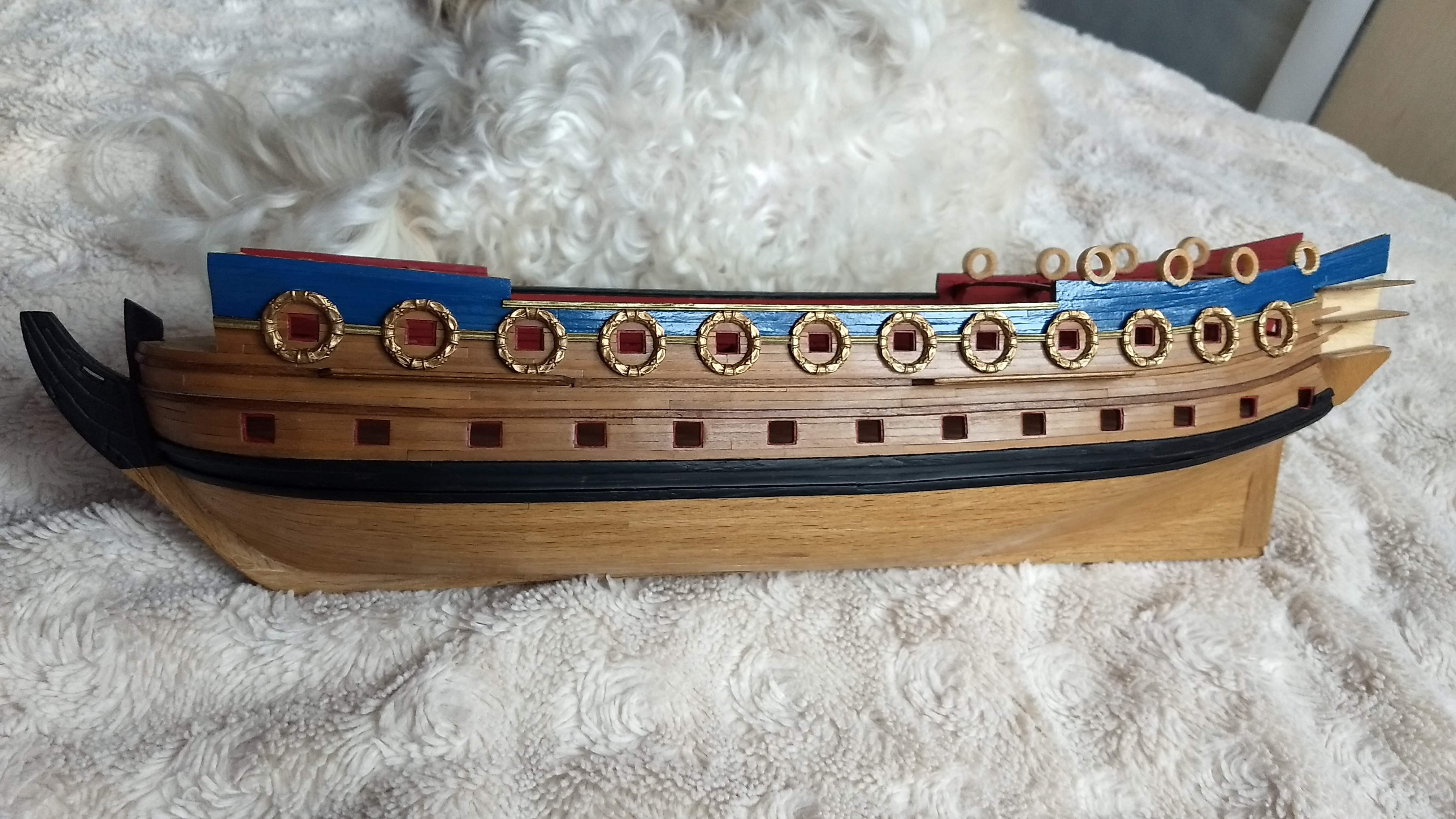 A tak wygląda postęp prac nad Przeznaczeniem. Skończyłem poszycie oraz pomalowałem wnętrze oraz burty, teraz uzupełniam działa na dolnym pokładzie i potem trzeba będzie ułożyć górny pokład.