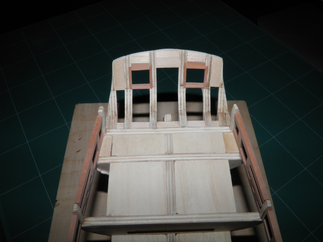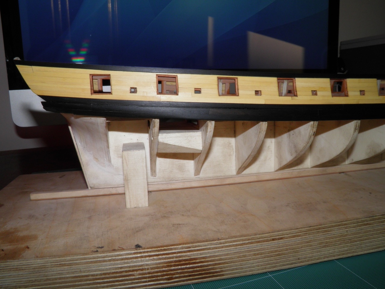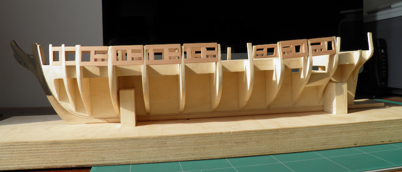 Na wzornik z furtami nakleiłem przezroczystą taśmę samoprzylepną i na niej sklejam elementy, co by się nie poprzyklejały do papieru i gotowe wklejam na miejsce. W na rufie i dziobie, gdzie pokład się wznosi, furty nie są w kształcie kwadratów tylko równoległoboków, przy tej metodzie idzie to szybciej i dokładniej. Kolejne osiem zamontowane jeszcze sześć i koniec, potem wyszlifuje je od zewnątrz do odpowiedniego kształtu i zajmę się rufą.