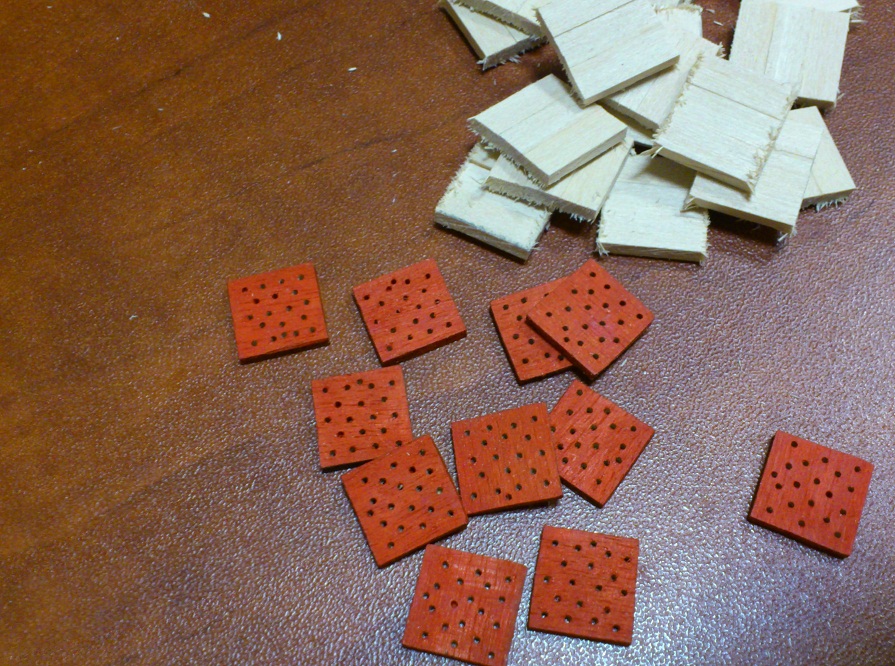 Na obu burtach wykonane elementy z batystu - prostokaty o wymiarze 18x35mm zwinięte i złozone na pół - na każdej burcie po 30szt. Rozpocząłem z uzyciem bloczków otrzymanych od Mirka wykonaywanie talii armat - do wykonania tylko 60szt - poszczególne etapy w kolejnym wpisie ze zdjęciami.