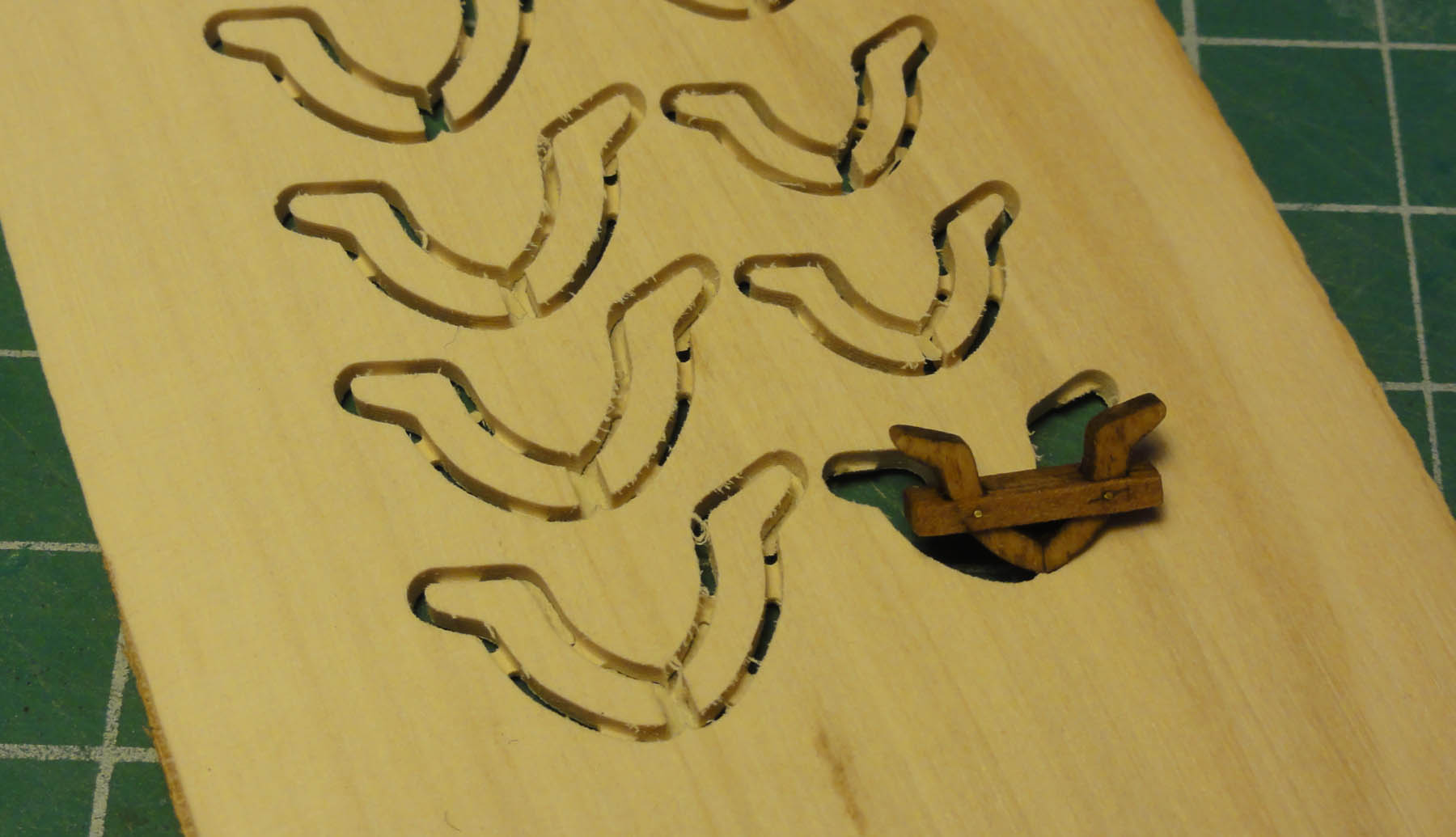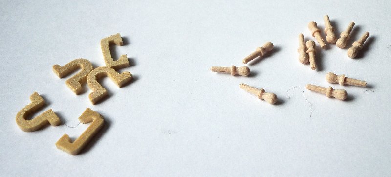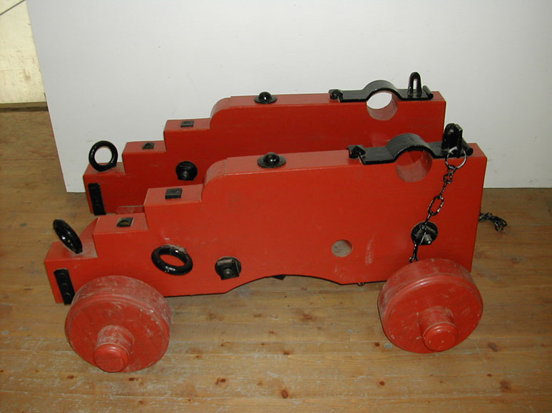 Kolejny element wymieniony to dewniane knagi (dwuczęściowe) i drewniane nagle (chyba lepsze od już wymienionych na metalowe z RB Model). I ostatnia z bieżących zmian: dziala i lawety będą jak ponizej: pozostaje tylko wykonanie imitacji okuć stalowych, dodanie klina, talii odciągającej i liny hamujacej (wcześniejsze lawety drewniane zostały "zdegradowane" na niższy pokład.