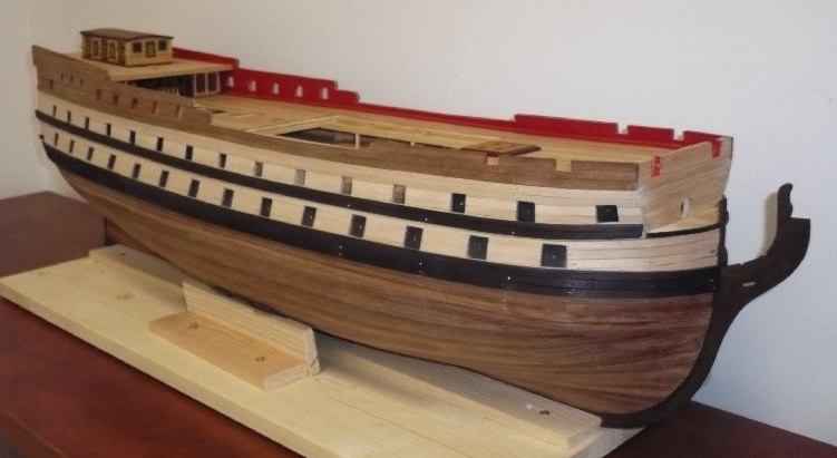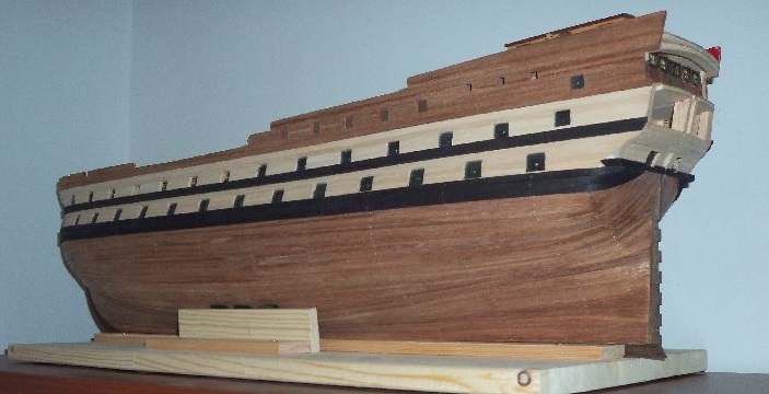Kolejny etap skończony - listwowanie na kadłubie w kolorze czarnym, uzupełnienia na dziobie i na rufie. W obróbce obecnie lawety dział, elementy wyposażenia (knagi, akcesoria artyleryjskie, szalupa). W najbliższym czasie do rozwiązania olinowanie przy kabestanach (rysunki i zdjęcia w kolejnym poście - będę wdzięczny za podpowiedzi forumowiczów).