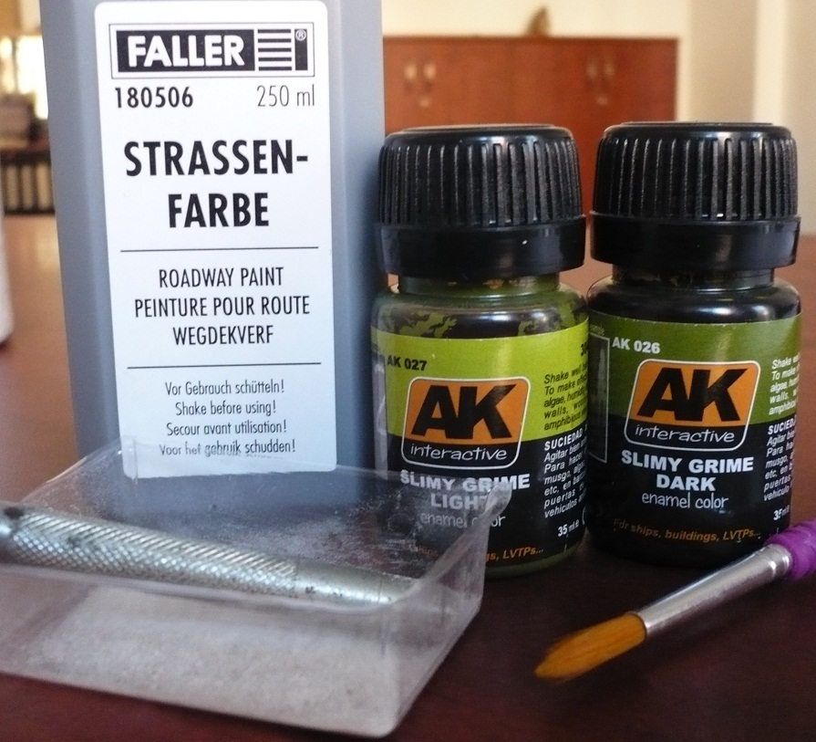 Dla wykonania końcowych warstw zgromadziłem farby firmy AK nr 026 i nr 027 o wdzięcznych nazwach "Jasny śluzowaty brud" i "Ciemny śluzowaty brud".
