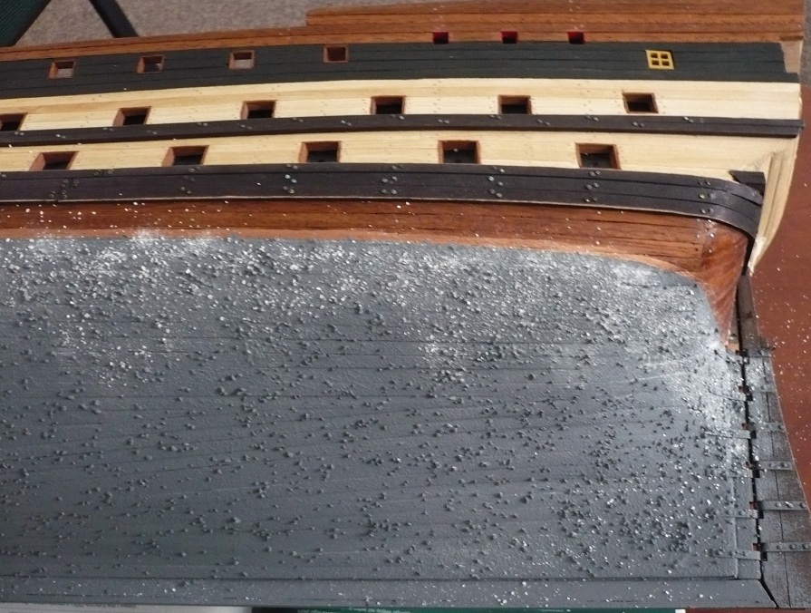 Trwają prace przy "zaglonieniu" kadłuba. Nałożyłem drugą warstwę o drobniejszej granulacji (wcześniej użyty piasek po rozdrobnieniu w małym moździrzu) przyklejona na farbie Faller.