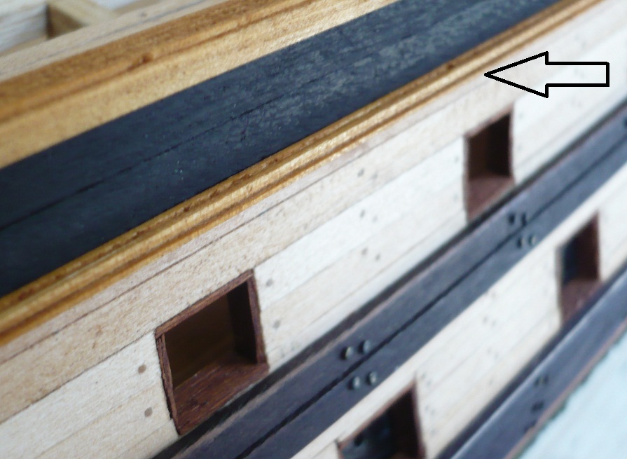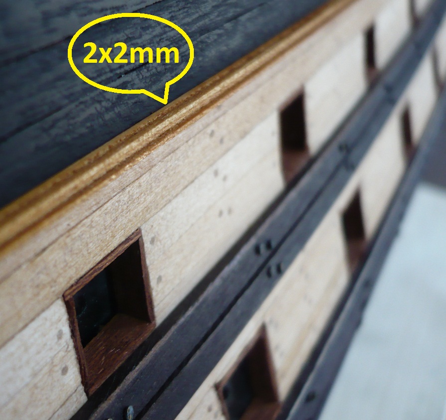 Zakończyłem frezowanie listewek 2x2mm (jak sugerował Myszor zrezygnowałem z mahoniu,który był w zestawie OcCre, choć listewki były już przygotowane łącznie z frezowaniem) - na zdjęciach pierwsza przyklejona do kadłuba po wcześniejszym potraktowaniu drewna bejcą (kolor buk) i lakierem bezbarwnym matowym.